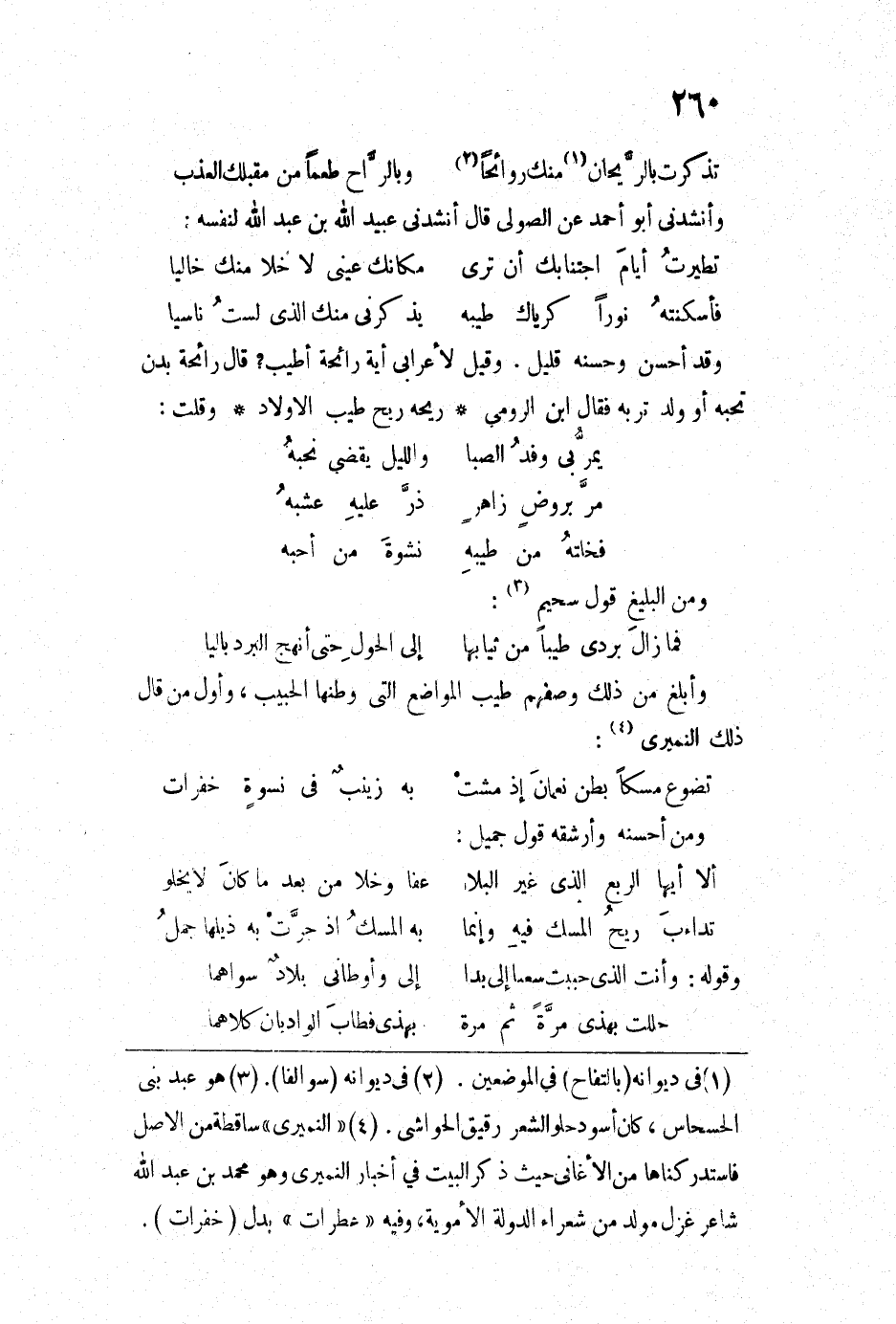 (فما زالَ بُردي طيباً من ثيابها ... إلى الحولِ حتى أنهجَ البردُ باليا) 5 وأبلغ من ذلك وصفهم طيب المواضع التي وطنها الحبيب، وأول من قال ذلك النميري: