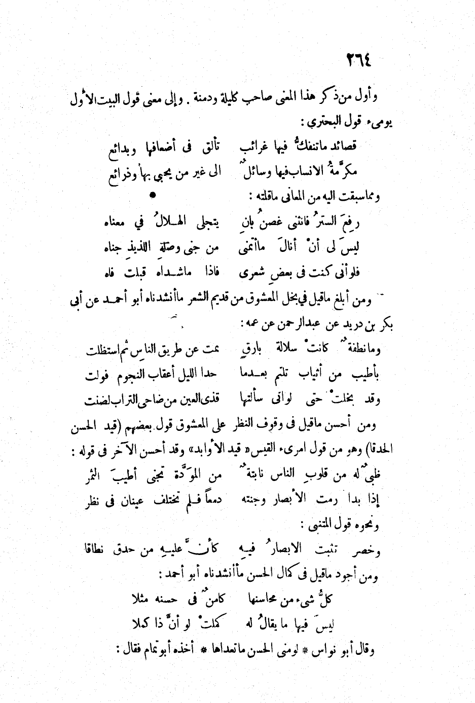 ومن أحسن ما قيل في وقوف النظر على المعشوق قول بعضهم (قيد الحسن عليه الحدقا) وهو من قول امرئ القيس (قيد الأوابد) وقد أحسن الآخر في وقوله: