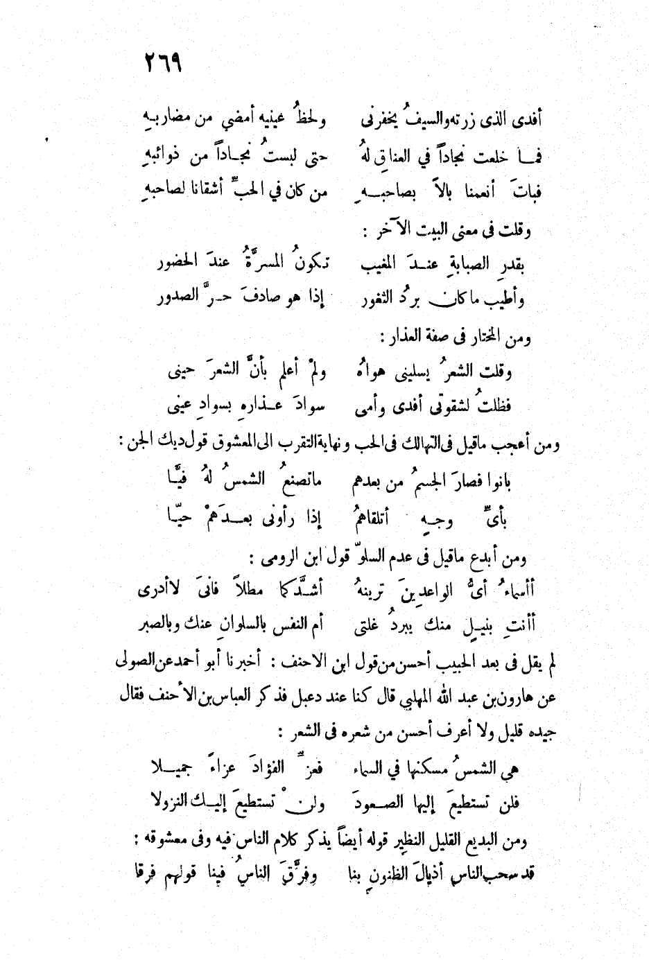 ومن أعجب ما قيل في التهالك في الحب ونهاية لاتنقرب إلى المعشوق قول ديك الجن: