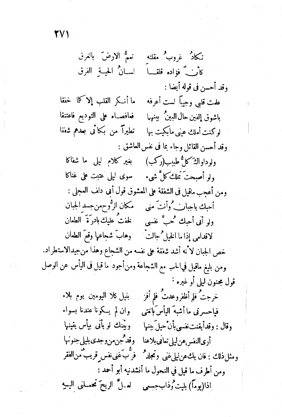 خص الجبان لأنه أشد شفقة على نفسه من الشجاع وهذا من جيد الاستطراد. ومن بليغ ما قيل في الحب مع الشجاعة ومن أجود ما قيل في اليأس عن الوصل قول مجنون ليلى أو غيره: