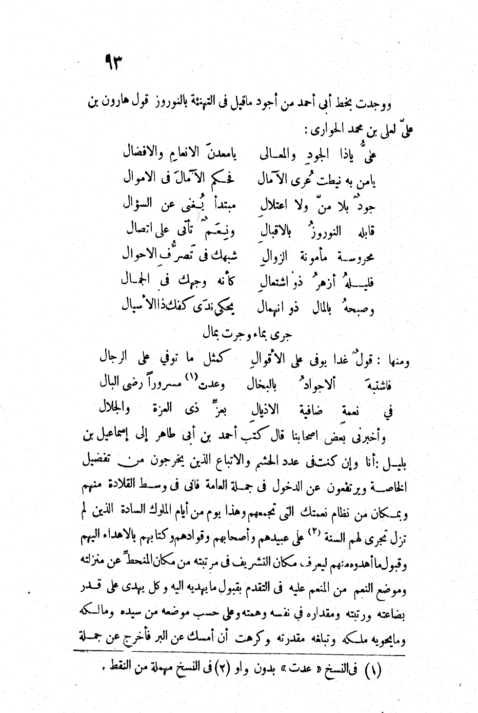 ووجدت بخط أبي أحمد من أجود ماقيل في التهنئة بالنوروز قول هارون بن علي لعلي بن محمد الحواري: