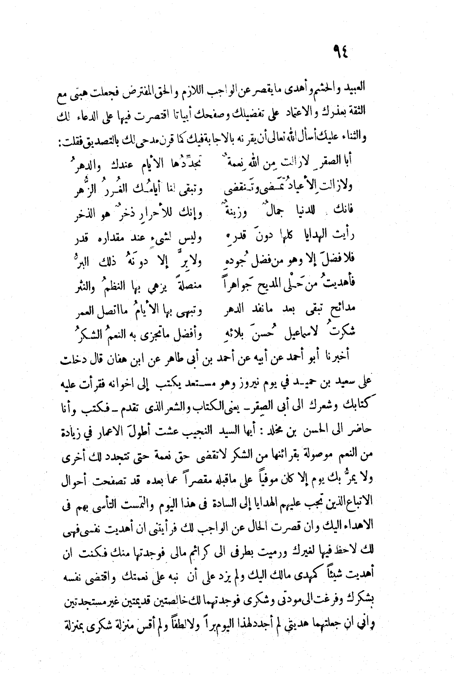 أخبرنا أبو أحمد عن أبيه عن أحمد بن أبي طاهر عن ابن هفان قال دخلت على سعيد بن حميد في يوم نيروز وهو مستعد يكتب إلى إخوانه فقرأت عليه كتابك وشعرك إلى أبي الصقر يعني الكتاب والشعر الذي تقدم فكتب وأنا حاضر إلى الحسن بن مخلد: أيها السيد النجيب عشت أطولَ الأعمار في زيادة من النعم موصولة بقرائنها من الشكر لا تقضي حق نعمة حتى تتجدد لك أخرى ولا يمر بك يوم إلا كان موفياً على ما قبله مقصراً عما بعده قد تصفحت أحوال الأتباع الذين تجب عليهم الهدايا إلى السادة في هذا اليوم والتمست التأسي بهم في الإهداء إليك وإن قصرت الحال عن الواجب لك فرأيتني أن أهديت نفسي فهي لك لاحظ فيها لغيرك ورميت بطرفي إلى كرائم مالي فوجدتها منك فكنت ان أهديت شيئاً كمهدي مالك إليك ولم يزد على أن نبه على نعمتك واقتضى نفسه بشكرك وفرغت إلى مودتي وشكري فوجدتهما لك خالصتين قديمتين غير مستجدتين وإني إن جعلهتما هديتي لم أجدد لهذا اليوم براً ولا لطفاً ولم أقس منزلة شكري بمنزلةٍ