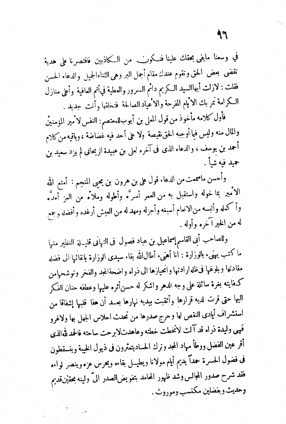 في وسعنا ما يفي بحقك علينا فنكون من الكاذبين فاقتصرنا على هدية تقضي بعض الحق وتقوم عندك مقام أجمل البر وهي الثناء الجميل والدعاء الحسن فقلت: لا زلت أيها السيد الكريم دائم السرور والعطية في أتم العافية وأعلى منازل الكرامة تمر بك الأيام المفرحة والأعياد الصالحة فتخلقها وأنت جديد. فأول كلامه مأخوذ من قول المعلى بن أيوب للمعتصم: النفس لأمير المؤمنين والمال منه وليس فيما أوجبه الحق نقيصة ولا على أحد فيه غضاضة، وباقيه من كلام أحمد بن يوسف، والدعاء الذي في آخره لعلي بن عبيدة الريحاني لم يزد سعيد بن حميد فيه شيئاً. وأحسن ما سمعت من الدعاء قول علي بن هارون بن يحيى المنجم: أمتع الله الأمير بما خوله واستقبل به من العمر اسره وأطوله وملأه من العز أمده وأكمله وألبسه من الإنعام أسبغه وأجزله ومهد له من العيش أرغده وأفضله وجمع له من الخير آخره وأوله. وللصاحب أبي القاسم إسماعيل بن عباد فصول في التهاني قليلة النظير منها ما كتب يهنئ بالوزارة: أنا أهنئ أطال الله بقاء سيدي الوزارة بإلقائها إلى فضله مقادتها وبلوغها في ظله ارادتها وانحيازها إلى ذراه واضحة المجد والفخر وتوشحها من كفايته بغرة سائلة على وجه الدهر واشكر له حسن أثره عليها وعطفه عنان الفكر إليها حتى قرت لديه قرارها وأثقبت بيديه نهارها بعد أن هفا قلبها إشفاقاً من استشراف أيادي النقص لها وحرج صدرها من تحدث احلاس الجهل بها ولا غرو فهي وليدة ذراه قد آلت لا تخطت خطته وعاهدت لا برحت ساحته فالحمد لله الذي أقر عين الفضل ووطأ مهاد المجد وترك الحساد يتعثرون في ذيول الخيبة ويتسقطون في فضول الحسرة حمداً يديم أيام مولانا ويطيل بقاءه ويحرس عزه وينصر لواءه فقد شرح صدور المجالس وشد ظهور المحامد بتفويض الصدر إلى وليمة بحقين قديم وحديث وبفضلين مكتسب وموروث.