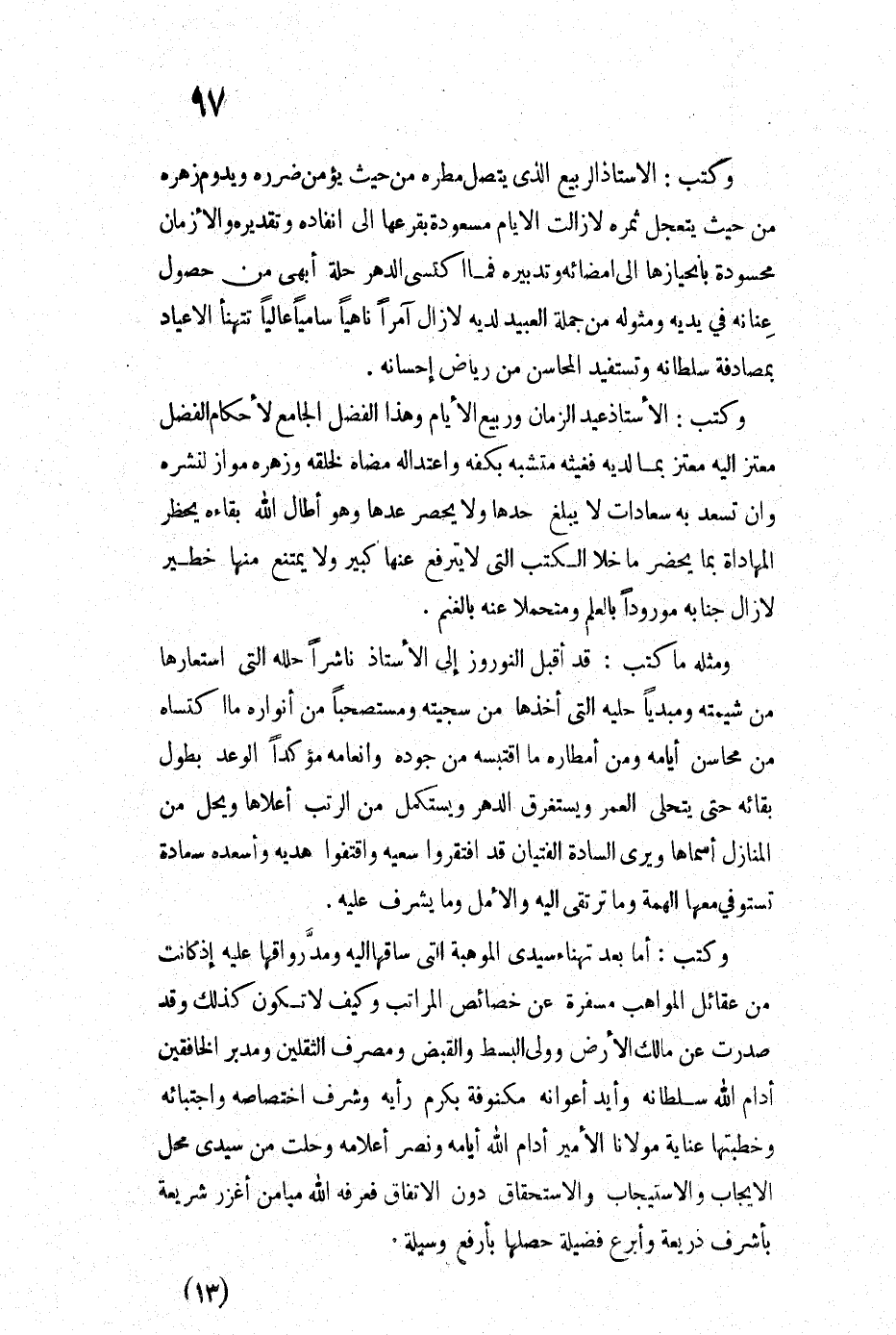 وكتب: الأستاذ الربيع الذي يتصل مطره من حيث يؤمن ضرره ويدوم زهره من حيث يتعجل ثمره لا زالت الأيام مسعودة بقرعها إلى إنفاذه وتقديره والأزمان محسودة بانحيازها إلى إمضائه وتدبيره فما اكتسى الدهر حلة أبهى من حصول عنانه في يديه ومثوله من جملة العبيد لديه لا زال آمراً ناهياً سامياً عالياً تتهنأ الأعياد بمصادفة سلطانه وتستفيد المحاسن من رياض إحسانه. وكتب: الأستاذ عيد الزمان وربيع الأيام وهذا الفضل الجامع لأحكام الفضل معتز إليه معتز بما لديه فغيثه متشبه بكفه واعتداله مضاهٍ لخلقه وزهره موازٍ لنشره وان تسعد به سعادات لا يبلغ حدها ولا يحصر عدها وهو أطال الله بقاءه يحظر المهاداة بما يحضر ما خلا الكتب التي لا يترفع عنها كبير ولا يمتنع منها خطير لا زال جنابه موروداً بالعلم ومحتملاً عنه بالغنم. ومثله ما كتب: قد أقبل النوروز إلى الأستاذ ناشراً حلله التي استعارها من شيمته ومبدياً حليه التي أخذها من سجيته ومستصحباً من أنواره ما اكتساه من محاسن أيامه ومن أمطاره ما اقتبسه من جوده وإنعامه مؤكداً الوعد بطول بقائه حتى يتحلى العمر ويستغرق الدهر ويستكمل من الرتب أعلاها ويحل من المنازل أسماها ويرى السادة الفتيان قد اقتفروا سعيه واقتفوا هديه وأسعده سعادة تستوفي معها الهمة وما ترتقي إليه والأمل وما يشرف عليه. وكتب: أما بعد تهناء سيدي الموهبة التي ساقها إليه ومد رواقها عليه إذا كانت من عقائل المواهب مسفرة عن خصائص المراتب وكيف لا تكون كذلك وقد صدرت عن مالك الأرض وولي البسط والقبض ومصرف الثقلين ومدبر الخافقين أدام الله سلطانه وأيد أعوانه مكنوفة بكرم رأيه وشرف اختصاصه واجتبائه وخطبتها عناية مولانا الأمير أدام الله أيامه ونصر أعلامه وحلت من سيدي محل الإيجاب والاستيجاب والاستحقاق دون الاتفاق فعرفه الله ميامن أعزر شريعة بأشرف ذريعة وأبرع فضيلة حصلها بأرفع وسيلة.