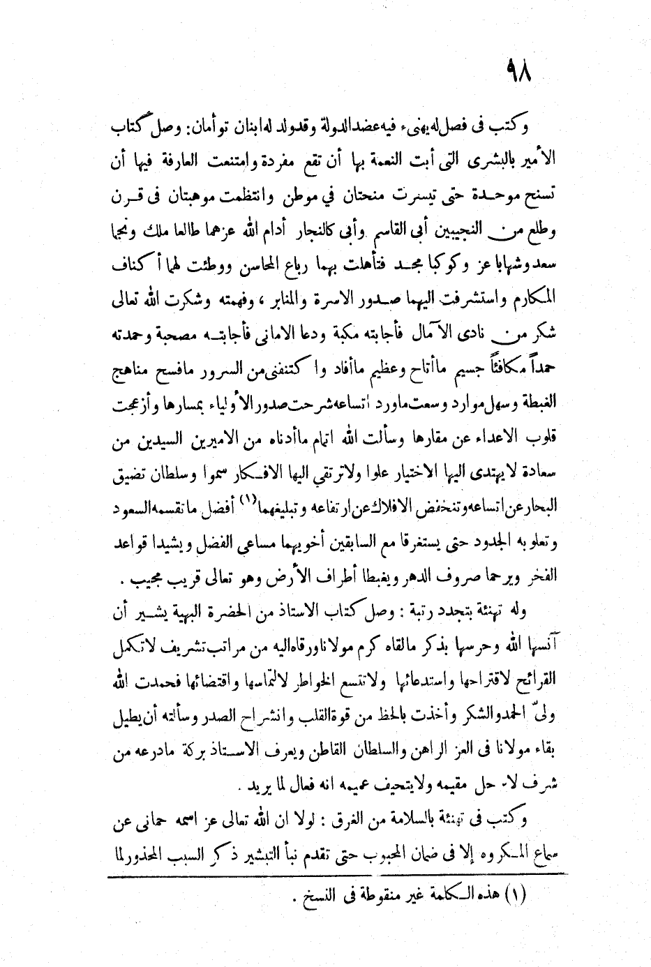 وكتب في فصل له يهنئ فيه عضد الدولة وقد ولد له ابنان توأمان: وصل كتاب الأمير بالبشرى التي أبت النعمة بها أن تقع مفردة وامتنعت العارفة فيها أن تسنح موحدة حتى تيسرت منحتان في موطن وانتظمت موهبتان في قرن وطلع من النجيبين أبي القاسم وأبي كالنجار أدام الله عزهما طالعاً ملكٍ ونجماً سعدٍ وشهابا عزٍ وكوكبا مجدٍ فتأهلت بهما رباع المحاسن ووطئت لهما أكناف المكارم واستشرفت إليهما صدور الأسرة والمنابر، وفهمته وشكرت الله تعالى شكر من نادى الآمال فأجابته مكبة ودعا الأماني فأجابته مصحبة وحمدته حمداً مكافئاً جسيم ما أتاح وعظيم ما أفاد واكتنفني من السرور ما فسح مناهج الغبطة وسهل موارد وسعت ما ورد اتساعه شرحت صدور الأولياء بمسارها وأزعجت قلوب الأعداء عن مقارها وسألت الله اتمام ما أدناه من الأميرين السيدين من سعادة لا يهتدي إليها الاختيار علواً ولا ترتقي إليها الأفكار سمواً وسلطان تضيق البحار عن اتساعه وتنخفض الأفلاك عن ارتفاعه وتبليغهما أفضل ما تقسمه السعود وتعلو به الجدود حتى يستغرقا مع السابقين أخويهما مساعي الفضل ويشيدا قواعد الفخر ويرحما صروف الدهر ويغبطا أطراف الأرض وهو تعالى قريب مجيب. وله تهنئة بتجدد رتبة: وصل كتاب الأستاذ من الحضرة البهية يشير أن آنسها الله وحرسها بذكر ما لقاه كرم مولانا ورقاه إليه من مراتب تشريف لا تكمل القرائح لاقتراحها واستدعائها ولا تتسع الخواطر لالتماسها واقتضائها فحمدت الله ولي الحمد والشكر وأخذت بالحظ من قوة القلب وانشراح الصدر وسألته أن يطيل بقاء مولانا في العز الراهن والسلطان القاطن ويعرف الاستاذ بركة ما درعه من شرف لا مدخل مقيمه ولا تيحيف عميمه إنه فعال لما يريد. وكتب في تهنئة بالسلامة من الغرق: لولا أن الله تعالى عز اسمه حماني عن سماع المكروه إلا في ضمان المحبوب حتى تقدم نبأ التبشير ذكر السبب المحذور لما