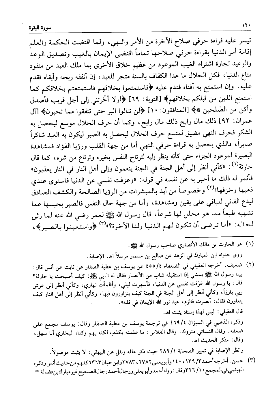 [ آل عمران : 92 ] ذلك مال رابح ذلك مال رابح ، وكما أن حرف الحلال موسع ليحصل به الشكر فحرف النهي مضيق لمتسع حرف الحلال ليحصل به الصبر ليكون به العبد شاكراً صابراً ، فالذي يحصل به قراءة حرفي النهي أما من جهة القلب ورؤيا الفؤاد فمشاهدة البصيرة لموعود الجزاء حتى كأنه ينظر إليه لترتاح النفس بخيره وترتاع من شره ، كما قال حارثة : ( كأني أنظر إلى أهل الجنة في الجنة ينعمون وإلى أهل النار في النار يعذبون ) فأثمر له ذلك ما أحبر به عن نفسه في قوله : ( وعزفت نفسي عن الدنيا فاستوى عندي ذهبها وخزفها ) وخصوصاً من أيد بالمبشرات من الرؤيا الصالحة والكشف الصادق ليدع الفاني للباقي على يقين ومشاهدة ، وأما من جهة حال النفس فالصبر بحبسها عما تشتهيه طبعاً مما هو محلل لها شرعاً ، قال رسول الله ( صلى الله عليه وسلم ) لعمر رضي الله عنه لما رثى لحاله : ( أما ترضى أن تكون لهم الدنيا ولنا الآخرة ؟ )