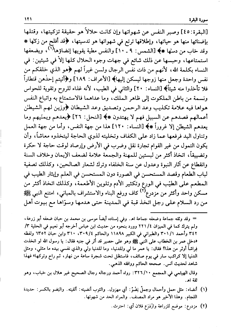 [ النساء : 120 ] هذا من جهة النفس ، وأما من جهة العمل وتناول اليد فرفعها عما زاد على الكفاف وتخليته لذوي الحاجة ليتخذوه معاشاً ، وأن يكون التمول من غير القوام تجارة نقل وضرب في الأرض وإرصاد لوقت حاجة لا حكرة وتضييقاً ، اتخاذ أكثر من لبستين للمهنة والجمعة علامة لضعف الإيمان وخلاف السنة وانقطاع عن آثار النبوة وعدول عن سنة الخلفاء وترك لشعار الصالحين ، وكذلك تصفية لباب الطعام وقصد المستحسن في الصورة دون المستحسن في العلم وإيثار الطيب في المطعم على الطيّب في الورع وتكثير الأدم وتلوين الأطعمة ، وكذلك اتخاذ أكثر من مسكن واحد وأكثر من مزدرع كاف ورفع البناء والاستشراف بالمباني ، امتنع النبي ( صلى الله عليه وسلم ) من رد السلام على رجل اتخذ قبة في المدينة حتى هدمها وسوّاها مع بيوت أهل
