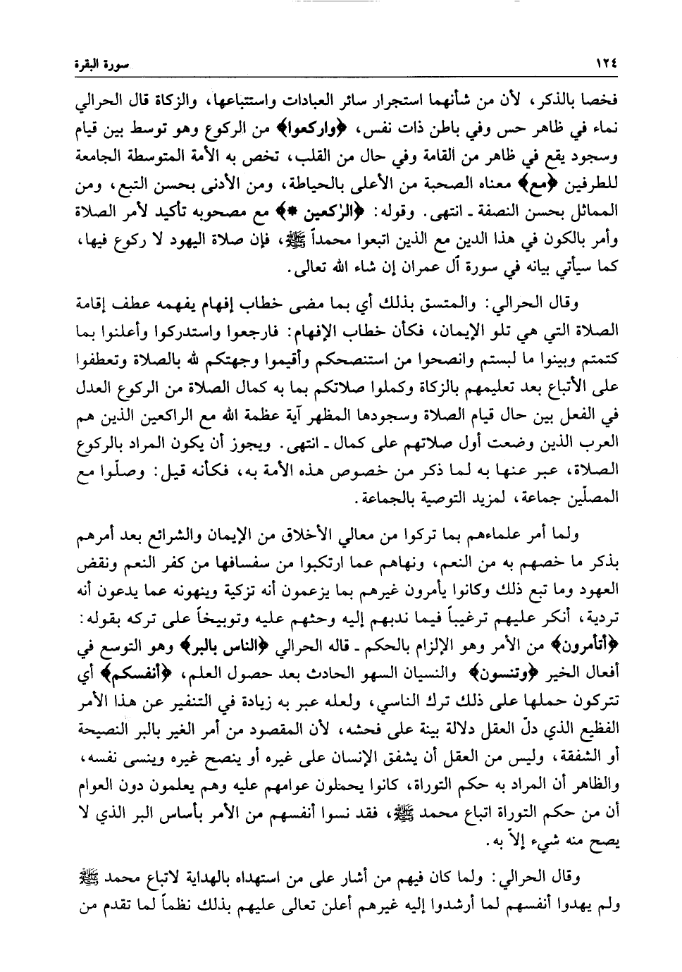 وقال الحرالي : والمتسق بذلك أي بما مضى خطاب إفهام يفهمه عطف إقامة الصلاة التي هي تلو الإيمان ، فكأن خطاب الإفهام : فارجعوا واستدركوا وأعلنوا بما كتمتم وبينوا ما لبستم وانصحوا من استنصحكم وأقيموا وجهتكم لله بالصلاة وتعطفوا على الأتباع بعد تعليمهم بالزكاة وكملوا صلاتكم بما به كمال الصلاة من الركوع العدل في الفعل بين حال قيام الصلاة وسجودها المظهر آية عظمة الله مع الراكعين الذين هم العرب الذين وضعت أول صلاتهم على كمال - انتهى .