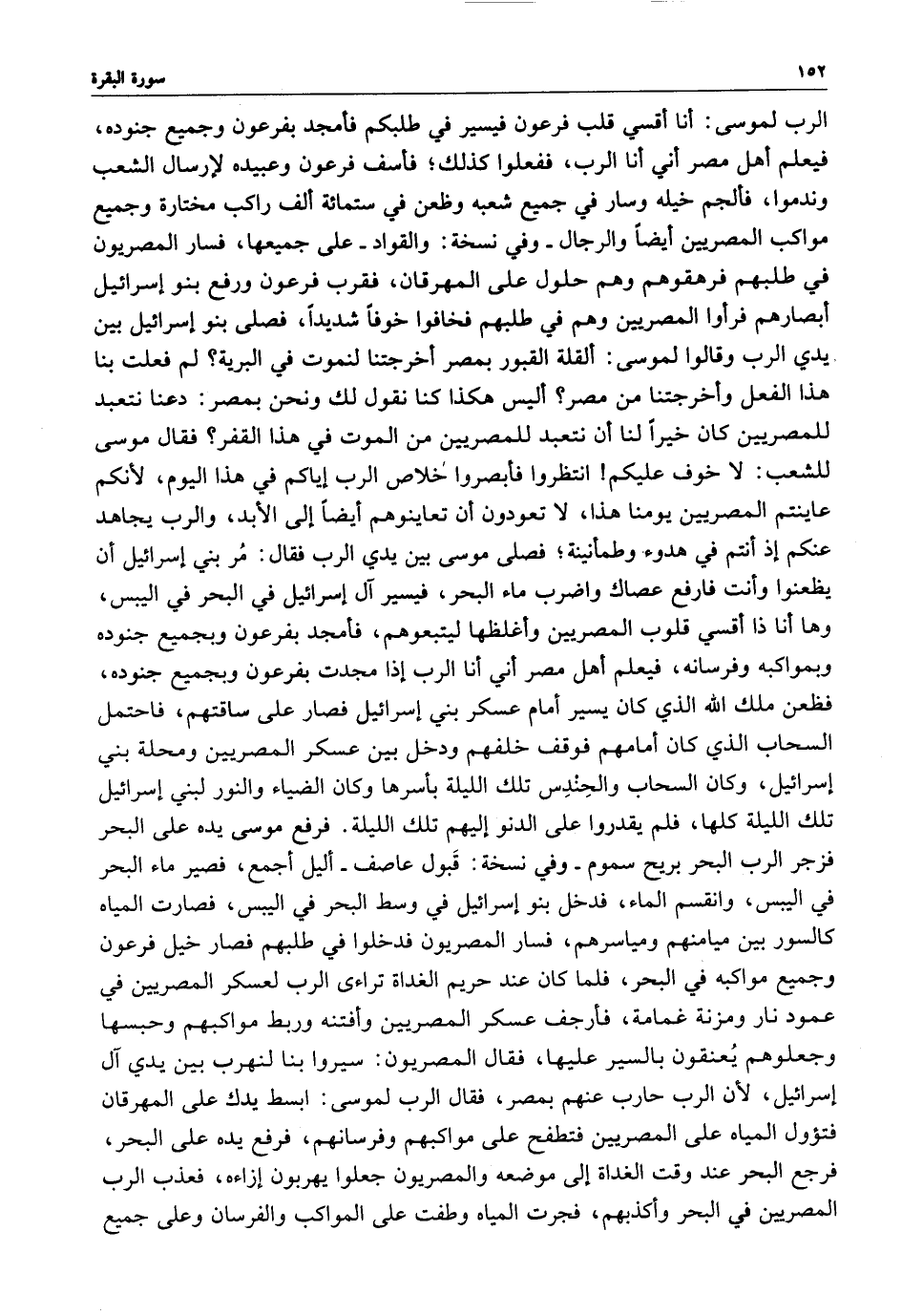 فرفع موسى يده على البحر فزجر الرب البحر بريح سموم - وفي نسخة : قَبول عاصف - أليل أجمع ، فصير ماء البحر في اليبس ، وانقسم الماء ، فدخل بنو إسرائيل في وسط البحر في اليبس ، فصارت المياه كالسور بين ميامنهم ومياسرهم ، فسار المصريون فدخلوا في طلبهم فصار خيل فرعون وجميع مواكبه في البحر ، فلما كان عند حريم الغداة تراءى الرب لعسكر المصريين في عمود نار ومزنة غمامة ، فأرجف عسكر المصريين وأفتنه وربط مواكبهم وحبسها وجعلوهم يُعنقون بالسير عليها ، فقال المصريون : سيروا بنا لنهرب بين يدي آل إسرائيل ، لأن الرب حارب عنهم بمصر ، فقال الرب لموسى : ابسط يدك على المهرقان فتؤول المياه على المصريين فتطفح على مواكبهم وفرسانهم ، فرفع يده على البحر ، فرجع البحر عند وقت الغداة إلى موضعه والمصريون جعلوا يهربون إزاءه ، فعذب الرب المصريين في البحر وأكذبهم ، فجرت المياه وطفت على المواكب والفرسان وعلى جميع