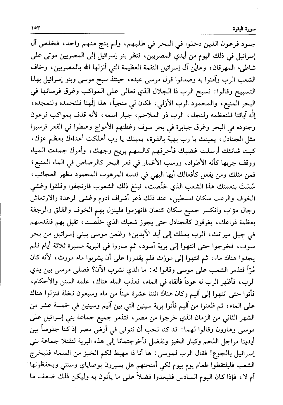 جنود فرعون الذين دخلوا في البحر في طلبهم ، ولم ينج منهم واحد ، فخلص آل إسرائيل في ذلك اليوم من أيدي المصريين ، فنظر بنو إسرائيل إلى المصريين موتى على شاطئ المهرقان ، وعاين آل إسرائيل النقمة العظيمة التي أنزلها الله بالمصريين ، وخاف الشعب الرب وآمنوا به وصدقوا قول موسى عبده ، حينئذ سبح موسى وبنو إسرائيل بهذا التسبيح وقالوا : نسبح الرب ذا الجلال الذي تعالى على المواكب وغرق فرسانها في البحر المنيع ، والمحمود الرب الأزلي ، فكان لي منجياً ، هذا إلهنا فلنحمده ولنمجده ، إله آبائنا فلنعظمه ولنجله ، الرب ذو الملاحم ، جبار اسمه ، لأنه قذف بمواكب فرعون وجنوده في البحر وغرق جبابرة في بحر سوف وغطتهم الأمواج وهبطوا في القعر فرسبوا مثل الجنادل ، يمينك يا رب بهية بالقوة ، يمينك يا رب أهلكت أعداءك بعظم عزك ، كبت شانئك أرسلت غضبك فأحرقهم كالسهم بريح وجهك ، وأمرك جمدت المياه ووقف جريها كأنه الأطواد ، ورسب الأغمار في قعر البحر كالرصاص في الماء المنيع ؛ فمن مثلك ومن يفعل كأفعالك أيها البهي في قدسه المرهوب المحمود مظهر العجائب ، سُسْتَ بنعمتك هذا الشعب الذي خلّصت ، فبلغ ذلك الشعوب فارتجفوا وقلقوا وغشي الخوف والرعب سكان فلسطين ، عند ذلك ذعر أشراف ادوم وغشى الرعدة والارتعاش رجال مؤاب وانكسر جميع سكان كنعان فانهزموا فلينزل بهم الخوف والقلق والرجفة بعظمة ذراعك ، يغرقون كالجنادل حتى يجوز شعبك الذي خلّصت ، تقبل بهم فتقدسهم في جبل ميرانك ، الرب يملك إلى أبد الآبدين ؛ وظعن موسى ببني إسرائيل من بحر سوف ، فخرجوا حتى انتهوا إلى برية أسود ، ثم ساروا في البرية مسيرة ثلاثة أيام فلم يجدوا هناك ماء ، ثم انتهوا إلى مورّث فلم يقدروا على أن يشربوا ماء مورث ، لأنه كان مُرّاً فتذمر الشعب على موسى وقالوا له : ما الذي نشرب الآن ؟ فصلى موسى بين يدي الرب ، فأظهر الرب له عوداً فألقاه في الماء ، فعذب الماء هناك ، علمه السنن والأحكام ، فأتوا حتى انتهوا إلى آليم وكان هناك اثنتا عشرة عيناً من ماء وسبعون نخلة فنزلوا هناك على الماء ، ثم ظعنوا من آليم فأتوا برية سينين التي بين آليم وسينين في خمسة عشر من الشهر الثاني من الزمان الذي خرجوا من مصر ، فتذمر جميع جماعة بني إسرائيل على موسى وهارون وقالوا لهما : قد كنا نحب أن نتوفى في أرض مصر إذ كنا جلوساً بين أيدينا مراجل اللحم وكبار الخبز ونفضل فأخرجتمانا إلى هذه البرية لتقتلا جماعة بني إسرائيل بالجوع فقال الرب لموسى : ها أنا ذا مهبط لكم الخبز من السماء فليخرج الشعب فليلتقطوا طعام يوم بيوم لكي أمتحنهم هل يسيرون بوصاياي وسنني ويحفظونها أم لا ، فإذا كان اليوم السادس فليعدوا فضلاً على ما يأتون به وليكن ذلك ضعف ما