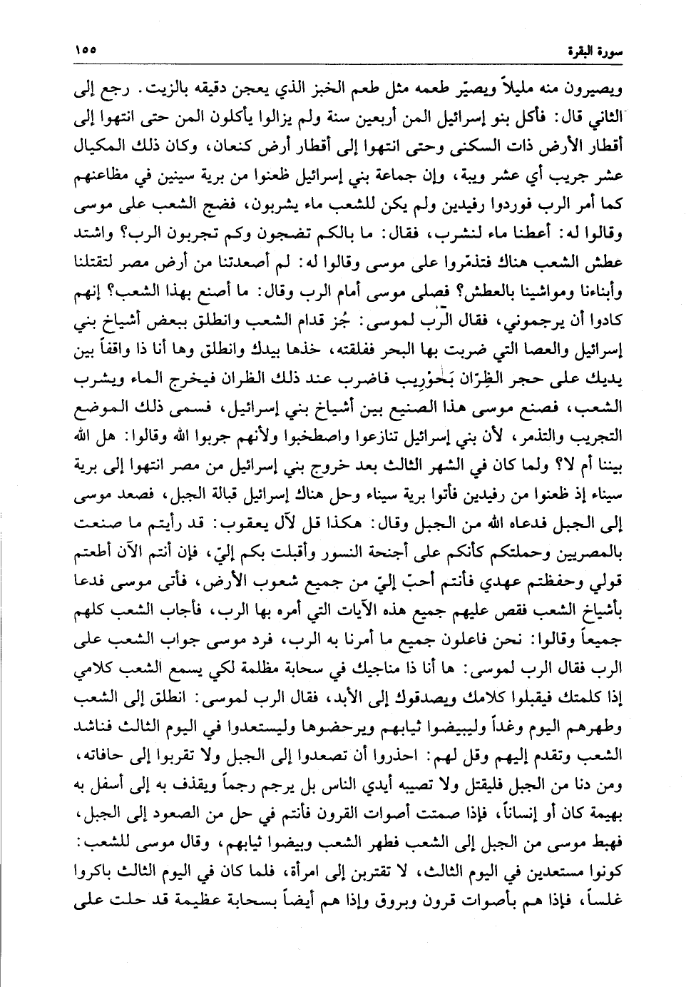 رجع إلى الثاني قال : فأكل بنو إسرائيل المن أربعين سنة ولم يزالوا يأكلون المن حتى انتهوا إلى أقطار الأرض ذات السكنى وحتى انتهوا إلى أقطار أرض كنعان ، وكان ذلك المكيال عشر جريب أي عشر ويبة ، وإن جماعة بني إسرائيلظعنوا من برية سينين في مظاعنهم كما أمر الرب فوردوا رفيدين ولم يكن للشعب ماء يشربون ، فضج الشعب على موسى وقالوا له : أعطنا ماء لنشرب ، فقال : ما بالكم تضجون وكم تجربون الرب ؟ واشتد عطش الشعب هناك فتذمّروا على موسى وقالوا له : لم أصعدتنا من أرض مصر لتقتلنا وأبناءنا ومواشينا بالعطش ؟ فصلى موسى أمام الرب وقال : ما أصنع بهذا الشعب ؟ إنهم كادوا أن يرجموني ، فقال الرب لموسى : جُز قدام الشعب وانطلق ببعض أشياخ بني إسرائيل والعصا التي ضربت بها البحر ففلقته ، خذها بيدك وانطلق وها أنا ذا واقفاً بين يديك على حجر الظِرّان بَحوْرِيب فاضرب عند ذلك الظران فيخرج الماء ويشرب الشعب ، فصنع موسى هذا الصنيع بين أشياخ بني إسرائيل ، فسمى ذلك الموضع التجري والتذمر ، لأن بني إسرائيل تنازعوا واصطخبوا ولأنهم جربوا الله وقالوا : هل الله بيننا أم لا ؟ ولما كان في الشهر الثالث بعد خروج بني إسرائيل من مصر انتهوا إلى برية سيناء إذ ظعنوا من رفيدين فأتوا برية سيناء وحل هناك إسرائيل قبالة الجبل ، فصعد موسى إلى الجبل فدعاه الله من الجبل وقال : هكذا قل لآل يعقوب : قد رأيتم ما صنعت بالمصريين وحملتكم كأنكم على أجنحة النسور وأقبلت بكم إليّ ، فإن أنتم الآن أطعتم قولي وحفظتم عهدي فأنتم أحبّ إليّ من جميع شعوب الأرض ، فأتى موسى فدعا بأشياخ الشعب فقص عليهم جميع هذه الآيات التي أمره بها الرب ، فأجاب الشعب كلهم جميعاً وقالوا : نحن فاعلون جميع ما أمرنا به الرب ، فرد موسى جواب الشعب على الرب فقال الرب لموسى : ها أنا ذا مناجيك في سحابة مظلمة لكي يسمع الشعب كلامي إذا كلمتك فيقبلوا كلامك ويصدقوك إلى الأبد ، فقال الرب لموسى : انطلق إلى الشعب وطهرهم اليوم وغداً وليبيضوا ثيابهم ويرحضوها وليستعدوا في اليوم الثالث فناشد الشعب وتقدم إليهم وقل لهم : احذروا أن تصعدوا إلى الجبل ولا تقربوا إلى حافاته ، ومن دنا من الجبل فليقتل ولا تصيبه أيدي الناس بل يرجم رجماً ويقذف به غلى أسفل به بهيمة كان أو إنساناً ، فإذا صمتت أصوات القرون فأنتم في حل من الصعود إلى الجبل ، فهبط موسى من الجبل إلى الشعب فطهر الشعب وبيضوا ثيابهم ، وقال موسى للشعب : كونوا مستعدين في اليوم الثالث ، لا تقتربن إلى امرأة ، فلما كان في اليوم الثالث باكروا غلساً ، فإذا هم بأصوات قرون وبروق وإذا هم أيضاً بسحابة عظيمة قد حلت على