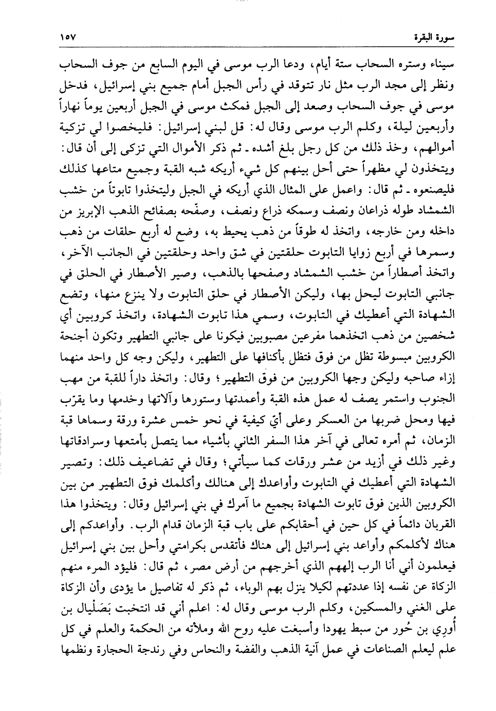 سيناء وستره السحاب ستة أيام ، ودعا الرب موسى في اليوم السابع من جوف السحاب ونظر غلى مجد الرب مثل نار تتوقد في رأس الجبل أمام جميع بني إسرائيل ، فدخل موسى في جوف السحاب وصعد إلى الجبل فمكث موسى في الجبل أربعين يوماً نهاراً وأربعين ليلة ، وكلم الرب موسى وقال له : قل لبني إسرائيل : فليخصوا لي تزكية أموالهم ، وخذ ذلك من كل رجل بلغ أشده - ثم ذكر الأموال التي تزكى إلى أن قال : ويتخذون لي مظهراً حتى أحل بينهم كل شيء أريكه شبه القبة وجميع متاعها كذلك فليصنعوه - ثم قال : واعمل على المثال الذي أريكه في الجبل وليتخذوا تابوتاً من خشب الشمشاد طوله ذراعان ونصف وسمكه ذراع ونصف ، وصفّحه بصفائح الذهب الإبريز من داخله ومن خارجه ، واتخذ له طوقاً من ذهب يحيط به ، وضع له أربع حلقات من ذهب وسمرها في أربع زوايا التابوت حلقتين في شق واحد وحلقتين في الجانب الآخر ، واتخذ أصطاراً من خشب الشمشاد وصفحها بالذهب ، وصير الأصطار في الحلق في جانبي التابوت ليحل بها ، وليكن الأصطار في حلق التابوت ولا ينزع منها ، وتضع الشهادة التي أعطيتك في التابوت ، وسمي هذا تابوت الشهادة ، واتخذ كروبين أي شخصين من ذهب اتخذهما مفرعين مصبوبين فيكونا على جانبي التطهير وتكون أجنحة الكروبين مبسوطة تظل من فوق فتظل بأكنافها على التطهير ، وليكن وجه كل واحد منهما إزاء صاحبه وليكن وجها الكروبين من فوق التطهير ؛ وقال : واتخذ داراً للقبة من مهب الجنوب واستمر يصف له عمل هذه القبة وأعمدتها وستورها وآلاتها وخدمها وما يقرّب فيها ومحل ضربها من العسكر وعلى أيّ كيفية في نحو خمس عشرة ورقة وسماها قبة الزمان ، ثم أمره تعالى في آخر هذا السفر الثاني بأشياء مما يتصل بأمتعها وسرادقاتها وغير ذلك في أزيد من عشر ورقات كما سيأتي ؛ وقال في تضاعيف ذلك : وتصير الشهادة التي أعطيك في التابوت وأواعدك إلى هنالك وأكلمك فوق التطهير من بين الكروبين الذين فوق تابوت الشهادة بجميع ما آمرك في بني غسرائيل وقال : ويتخذوا هذا القربان دائماً في كل حين في أحقابكم على باب قبة الزمان قدام ارب .