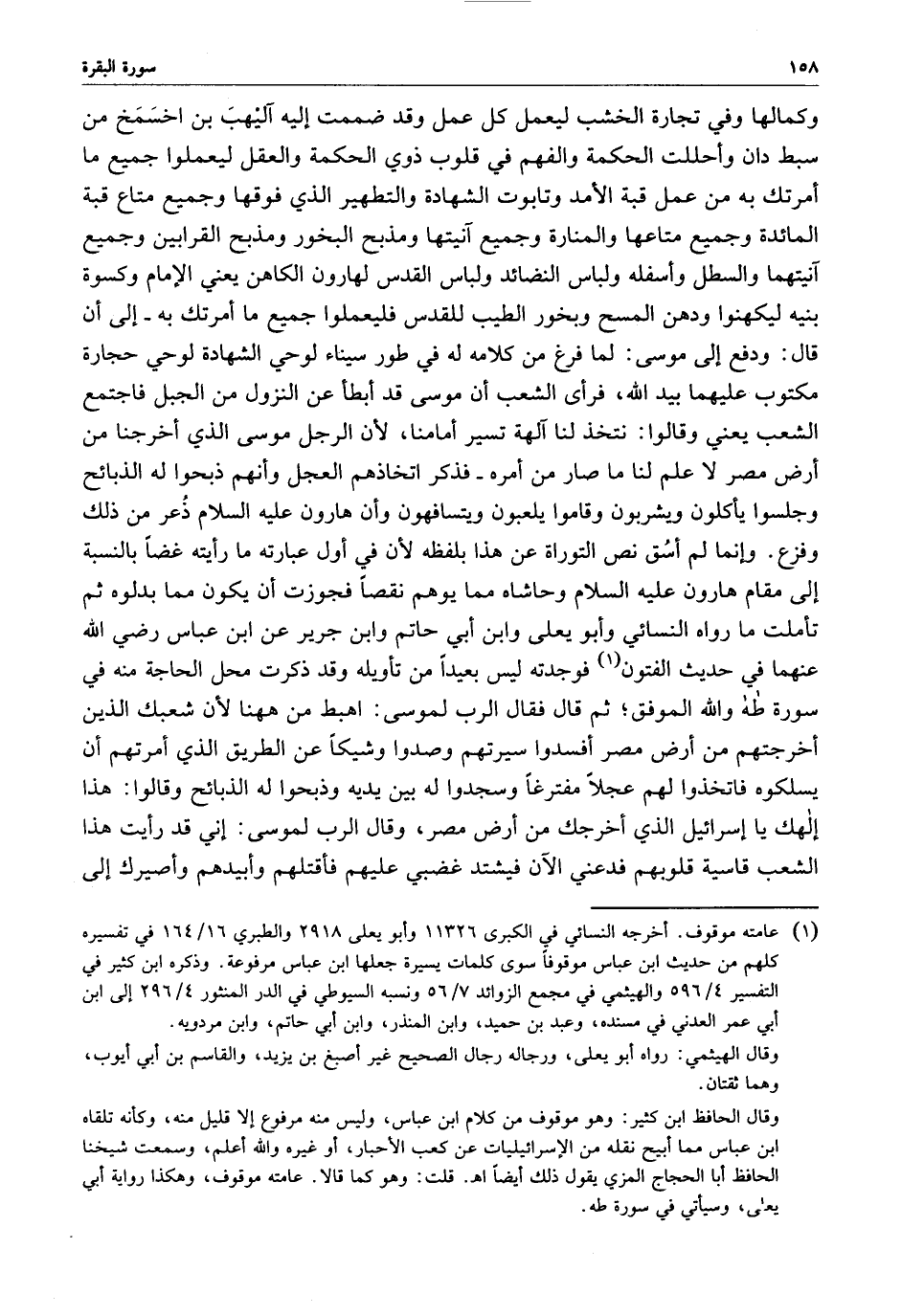 وإنما لم أسُق نص التوراة عن هذا بلفظه لأن في أول عبارته ما رأيته غضاً بالنسبة إلى مقام هارون عليه السلام وحاشاه مما يوهم نقصاً فجوزت أن يكون مما بدلوه ثم تأملت ما رواه النسائي وأبو يعلى وابن أبي حاتم وابن جرير عن ابن عباس رضي الله عنهما في حديث الفتون فوجدته ليس بعيداً من تأويله وقد ذكرت محل الحاجة منه في سورة طه والله الموفق ؛ ثم قال فقال الرب لموسى : اهبط من ههنا لأن شعبك الذين أخرجتهم من أرض مصر أفسدوا سيرتهم وصدوا وشيكاً عن الطريق الذي أمرتهم أن يسلكوه فاتخذوا لهم عجلاً مفترغاً وسجدوا له بين يديه وذبحوا له الذبائح وقالوا : هذا إلهك يا إسرائيل الذي أخرجك من أرض مصر ، وقال الرب لموسى : إني قد رأيت هذا الشعب قاسية قلوبهم فدعني الآن فيشتد غضبي عليهم فأقتلهم وأبيدهم وأصيرك إلى