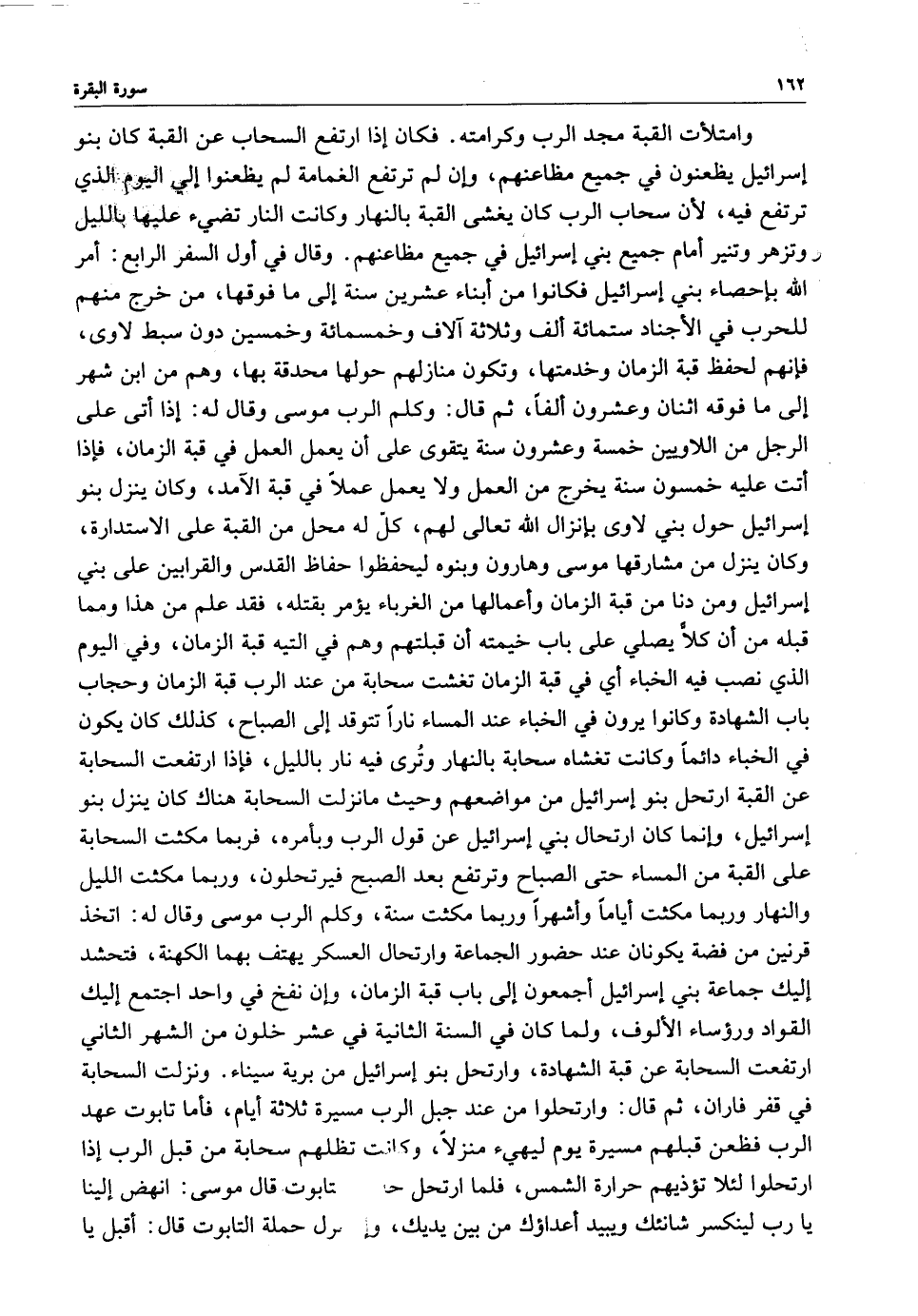 وقال في أول السفر الرابع : أمر الله بإحصاء بني إسرائيل فكانوا من أبناء عشرين سنة إلى ما فوقها ، من خرج منهم للحرب في الأجناد ستمائة ألف وثلاثة آلاف وخمسمائة وخمسين دون سبط لاوى ، فإنهم لحفظ قبة الزمان وخدمتها ، وتكون منازلهم حولها محدقة بها ، وهم من ابن شهر إلى ما فوقه اثنان وعشرون ألفاً ، ثم قال : وكلم الرب موسى وقال له : إذا أتى على الرجل من اللاويين خمسة وعشرون سنة يتقوى على أن يعمل العمل في قبة الزمان ، فإذا أتت عليه خمسون سنة يخرج من العمل ولا يعمل عملاً في قبة الآمد ، وكان ينزل بنو إسرائيل حول بني لاوى بإنزال الله تعالى لهم ، كلّ له محل من القبة على الاستدارة ، وكان ينزل من مشارقها موسى وهارون وبنوه ليحفظوا حفاظ القدس والقرابين على بني إسرائيل ومن دنا من قبة الزمان وأعمالها من الغرباء يؤمر بقتله ، فقد علم من هذا ومما قبله من أن كلاًّ يصلي على باب خيمته أن قبلتهم وهم في التيه قبة الزمان ، وفي اليوم الذي نصب فيه الخباء أي في قبة الزمان تغشت سحابة من عند الرب قبة الزمان وحجاب باب الشهادة وكانوا يرون في الخباء عند المساء ناراً تتوقد إلى الصباح ، كذلك كان يكون في الخباء دائماً وكانت تغشاه سحابة بالنهار وتُرى فيه نار بالليل ، فإذا ارتفعت السحابة عن القبة ارتحل بنو إسرائيل من مواضعهم وحيث ما نزلت السحابة هناك كان ينزل بنو إسرائيل ، وإنما كان ارتحال بني إسرائيل عن قول الرب وبأمره ، فربما مكثت السحابة على القبة من المساء حتى الصباح وترتفع بعد الصبح فيرتحلون ، وربما مكثت الليل والنهار وربما مكثت أياماً وأشهراً وربما مكثت سنة ، وكلم الرب موسى وقال له : اتخذ قرنين من قضة يكونان عند حضور الجماعة وارتحال العسكر يهتف بهما الكهنة ، فتحشد إليك جماعة بني إسرائيل أجمعون إلى باب قبة الزمان ، وإن نفخ في واحد اجتمع إليك القواد ورؤساء الألوف ، ولما كان في السنة الثانية في عشر خلون من الشهر الثاني ارتفعت السحابة عن قبة الشهادة ، وارتحل بنو إسرائيل من برية سيناء .