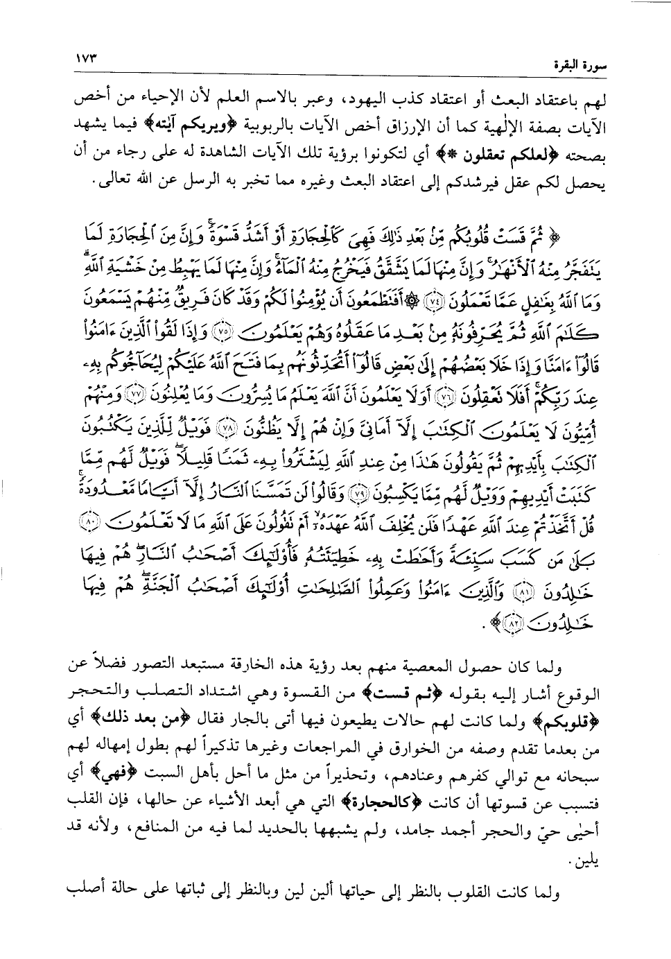 ) ثُمَّ قَسَتْ قُلُوبُكُمْ مِّن بَعْدِ ذلِكَ فَهِيَ كَالْحِجَارَةِ أَوْ أَشَدُّ قَسْوَةً وَإِنَّ مِنَ الْحِجَارَةِ لَمَا يَتَفَجَّرُ مِنْهُ الأَنْهَارُ وَإِنَّ مِنْهَا لَمَا يَشَّقَّقُ فَيَخْرُجُ مِنْهُ الْمَآءُ وَإِنَّ مِنْهَا لَمَا يَهْبِطُ مِنْ خَشْيَةِ اللَّهِ وَمَا اللَّهُ بِغَافِلٍ عَمَّا تَعْمَلُونَ أَفَتَطْمَعُونَ أَن يُؤْمِنُواْ لَكُمْ وَقَدْ كَانَ فَرِيقٌ مِّنْهُمْ يَسْمَعُونَ كَلاَمَ اللَّهِ ثُمَّ يُحَرِّفُونَهُ مِن بَعْدِ مَا عَقَلُوهُ وَهُمْ يَعْلَمُونَ وَإِذَا لَقُواْ الَّذِينَ آمَنُواْ قَالُواْ آمَنَّا وَإِذَا خَلاَ بَعْضُهُمْ إِلَى بَعْضٍ قَالُواْ أَتُحَدِّثُونَهُم بِمَا فَتَحَ اللَّهُ عَلَيْكُمْ لِيُحَآجُّوكُم بِهِ عِنْدَ رَبِّكُمْ أَفَلاَ تَعْقِلُونَ أَوَلاَ يَعْلَمُونَ أَنَّ اللَّهَ يَعْلَمُ مَا يُسِرُّونَ وَمَا يُعْلِنُونَ وَمِنْهُمْ أُمِّيُّونَ لاَ يَعْلَمُونَ الْكِتَابَ إِلاَّ أَمَانِيَّ وَإِنْ هُمْ إِلاَّ يَظُنُّونَ فَوَيْلٌ لِّلَّذِينَ يَكْتُبُونَ الْكِتَابَ بِأَيْدِيهِمْ ثُمَّ يَقُولُونَ هَذَا مِنْ عِنْدِ اللَّهِ لِيَشْتَرُواْ بِهِ ثَمَناً قَلِيلاً فَوَيْلٌ لَّهُمْ مِّمَّا كَتَبَتْ أَيْدِيهِمْ وَوَيْلٌ لَّهُمْ مِّمَّا يَكْسِبُونَ وَقَالُواْ لَن تَمَسَّنَا النَّارُ إِلاَّ أَيَّاماً مَّعْدُودَةً قُلْ أَتَّخَذْتُمْ عِندَ اللَّهِ عَهْداً فَلَنْ يُخْلِفَ اللَّهُ عَهْدَهُ أَمْ تَقُولُونَ عَلَى اللَّهِ مَا لاَ تَعْلَمُونَ بَلَى مَن كَسَبَ سَيِّئَةً وَأَحَاطَتْ بِهِ خَطِيئَتُهُ فَأُوْلَئِكَ أَصْحَابُ النَّارِ هُمْ فِيهَا خَالِدُونَ وَالَّذِينَ آمَنُواْ وَعَمِلُواْ الصَّالِحَاتِ أُولَئِكَ أَصْحَابُ الْجَنَّةِ هُمْ فِيهَا خَالِدُونَ ( ( )