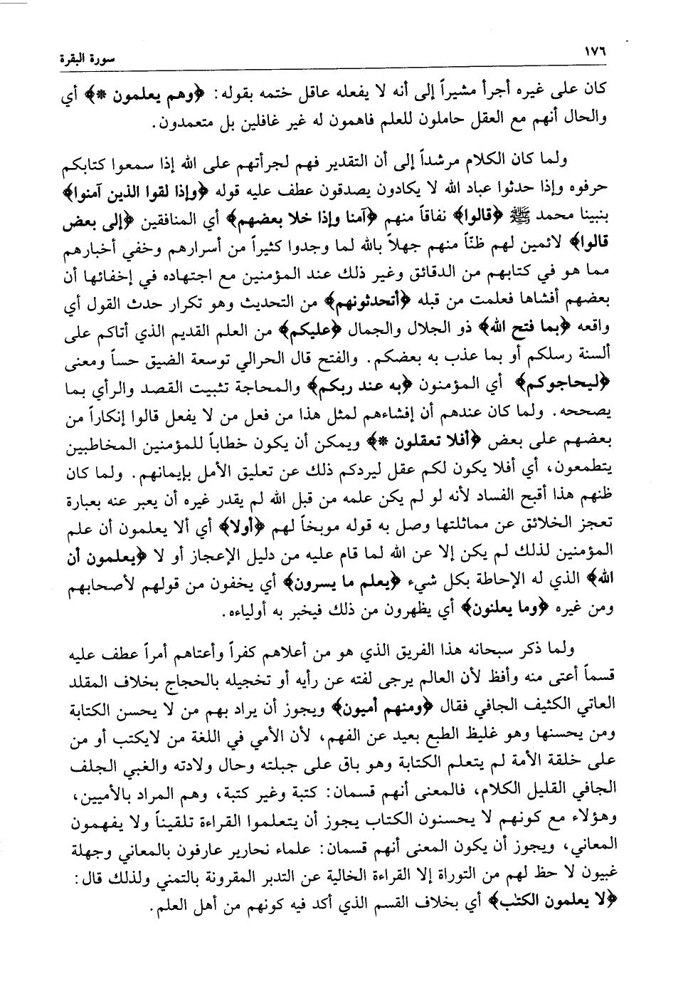 ولما كان الكلام مرشداً إلى أن التقدير فهم لجرأتهم على الله إذا سمعوا كتابكم حرفوه وإذا حدثوا عباد الله لا يكادون يصدقون عطف عليه قوله ) وإذا لقوا الذين آمنوا ( بنبينا محمد ( صلى الله عليه وسلم ) ) قالوا ( نفاقاً منهم ) آمنا وإذا خلا بعضهم ) أي المنافقين ) إلى بعض قالوا ( لائمين لهم ظنّاً منهم جهلاً بالله لما وجدوا كثيراً من أسرارهم وخفي أخبارهم مما هو في كتابهم من الدقائق وغير ذلك عند المؤمنين مع اجتهاده في إخفائها أن بعضهم أفشاها فعلمت من قبله ) أتحدثونهم ( من التحديث وهو تكرار حدث القول أي واقعه ) بما فتح الله ( ذو الجلال والجمال ) عليكم ( من العلم القديم الذي أتاكم على ألسنة رسلكم أو بما عذب به بعضكم .