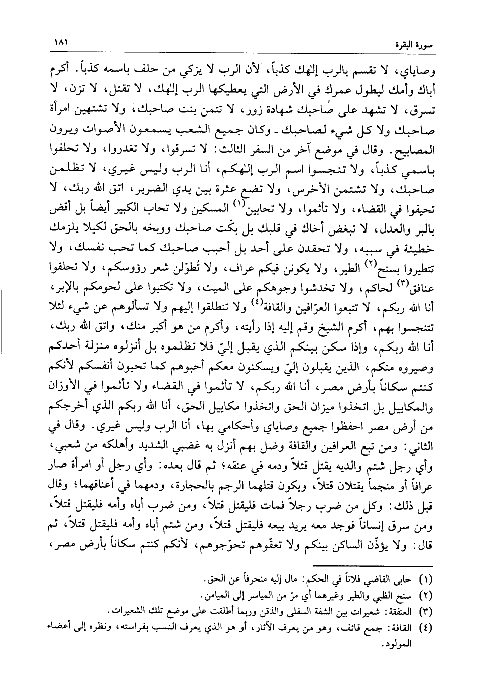 وقال في موضع آخر من السفر الثالث : لا تسرقوا ، ولا تغدروا ، ولا تحلفوا باسمي كذباً ، ولا تنجسوا اسم الرب إلهكم ، أنا الرب وليس غيري ، لا تظلمن صاحبك ، ولا تشتمن الأخرس ، ولا تضع عثرة بين يدي الضرير ، اتق الله ربك ، لا تحيفوا في القضاء ، ولا تأثموا ، ولا تحابين المسكين ولا تحاب الكبير أيضاً بل أقض بالبر والعدل ، لا تبغض أخاك في قلبك بل بكّت صاحبك ووبخه بالحق لكيلا يلزمك خطيئة في سببه ، ولا تحقدن على أحد بل أحبب صاحبك كما تحب نفسك ، ولا تتطيروا بسنح الطير ، ولا يكونن فيكم عراف ، ولا تُطوّلن شعر رؤوسكم ، ولا تحلقوا عنافق لحاكم ، ولا تخدشوا وجوهكم على الميت ، ولا تكتبوا على لحومكم بالإبر ، أنا الله ربكم ، لا تتبعوا العرّافين والقافة ولا تنطلقوا إليهم ولا تسألوهم عن شيء لئلا تتنجسوا بهم ، أكرم الشيخ وقم إليه إذا رأيته ، وأكرم من هو أكبر منك ، واتق الله ربك ، أنا الله ربكم ، وإذا سكن بينكم الذي يقبل إليّ فلا تظلموه بل أنزلوه منزلة أحدكم وصيروه منكم ، الذين يقبلون إليّ ويسكنون معكم أحبوهم كما تحبون أنفسكم لأنكم كنتم سكاناً بأرض مصر ، أنا الله ربكم ، لا تأثموا في القضاء ولا تأثموا في الأوزان والمكاييل بل اتخذوا ميزان الحق واتخذوا مكاييل الحق ، أنا الله ربكم الذي أخرجكم من أرض مصر احفظوا جميع وصاياي وأحكامي بها ، أنا الرب وليس غيري .