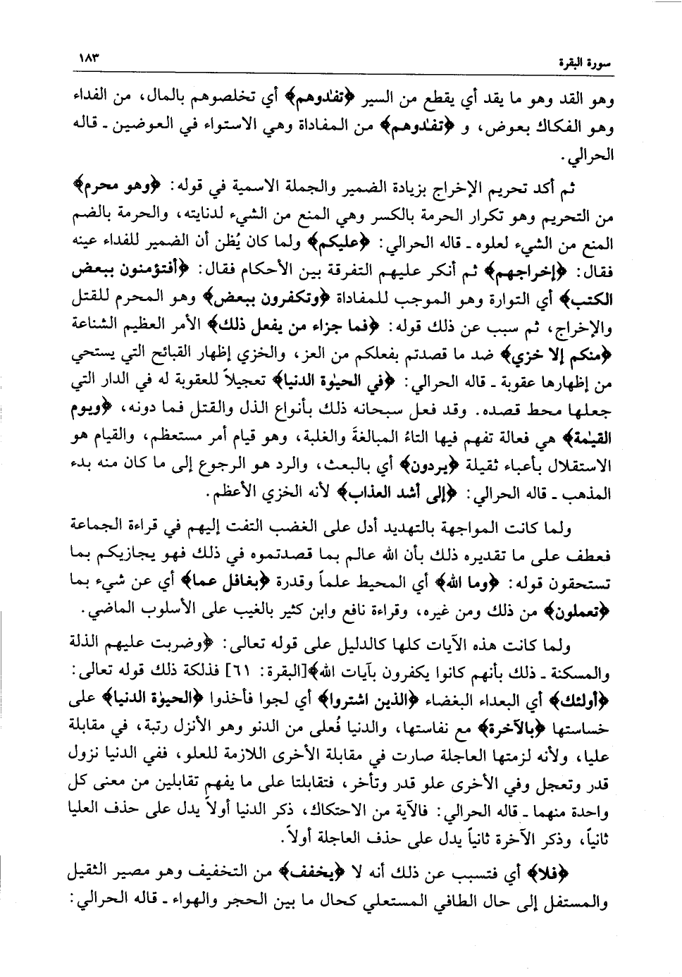 ثم أكد تحريم الإخراج بزيادة الضمير والجملة الاسمية في قوله : ( وهو محرم ( من التحريم وهو تكرار الحرمة بالكسر وهي المنع من الشيء لدنايته ، والحرمة بالضم المنع من الشيء لعلوه - قاله الحرالي : ( عليكم ( ولما كان يُظن أن الضمير للفداء عينه فقال : ( إخراجهم ( ثم أنكر عليهم التفرقة بين الأحكام فقال : ( أفتؤمنون ببعض الكتاب ) أي التوراة وهو الموجب للمفاداة ) وتكفرون ببعض ( وهو المحرم للقتل والإخراج ، ثم سبب عن ذلك قوله : ( فما جزاء من يفعل ذلك ( الأمر العظيم الشناعة ) منكم إلا خزي ( ضد ما قصدتم بفعلكم من العز ، والخزي إظهار القبائح التي يستحي من إظهارها عقوبة - قاله الحرالي : ( في الحياة الدنيا ( تعجيلاً للعقوبة له في الدار التي جعلها محط قصده .