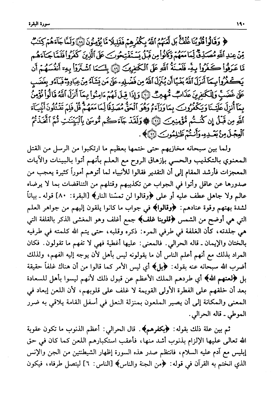 ) وَقَالُواْ قُلُوبُنَا غُلْفٌ بَل لَّعَنَهُمُ اللَّهُ بِكُفْرِهِمْ فَقَلِيلاً مَّا يُؤْمِنُونَ وَلَمَّا جَآءَهُمْ كِتَابٌ مِّنْ عِندِ اللَّهِ مُصَدِّقٌ لِّمَا مَعَهُمْ وَكَانُواْ مِن قَبْلُ يَسْتَفْتِحُونَ عَلَى الَّذِينَ كَفَرُواْ فَلَمَّا جَآءَهُمْ مَّا عَرَفُواْ كَفَرُواْ بِهِ فَلَعْنَةُ اللَّهِ عَلَى الْكَافِرِينَ بِئْسَمَا اشْتَرَوْاْ بِهِ أَنْفُسَهُمْ أَن يَكْفُرُواْ بِمَآ أنَزَلَ اللَّهُ بَغْياً أَن يُنَزِّلُ اللَّهُ مِن فَضْلِهِ عَلَى مَن يَشَآءُ مِنْ عِبَادِهِ فَبَآءُو بِغَضَبٍ عَلَى غَضَبٍ وَلِلْكَافِرِينَ عَذَابٌ مُّهِينٌ وَإِذَا قِيلَ لَهُمْ آمِنُواْ بِمَا أَنْزَلَ اللَّهُ قَالُواْ نُؤْمِنُ بِمَآ أُنْزِلَ عَلَيْنَا وَيَكْفُرونَ بِمَا وَرَآءَهُ وَهُوَ الْحَقُّ مُصَدِّقاً لِّمَا مَعَهُمْ قُلْ فَلِمَ تَقْتُلُونَ أَنْبِيَآءَ اللَّهِ مِن قَبْلُ إِن كُنْتُمْ مُّؤْمِنِينَ وَلَقَدْ جَآءَكُمْ مُّوسَى بِالْبَيِّنَاتِ ثُمَّ اتَّخَذْتُمُ الْعِجْلَ مِن بَعْدِهِ وَأَنْتُمْ ظَالِمُونَ ( ( )