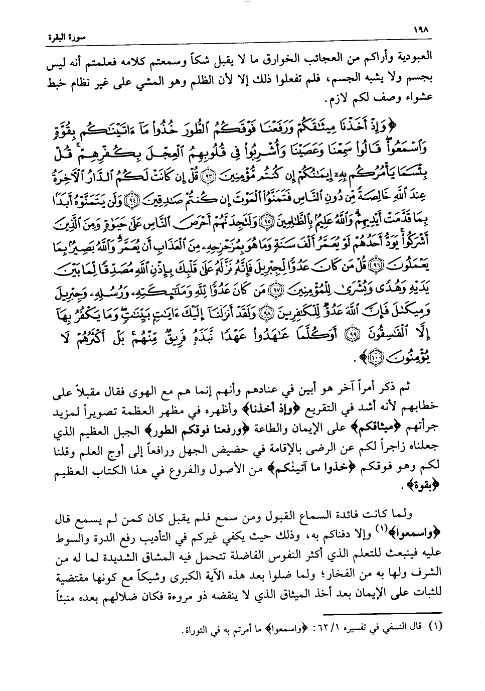 ) وَإِذْ أَخَذْنَا مِيثَاقَكُمْ وَرَفَعْنَا فَوْقَكُمُ الطُّورَ خُذُواْ مَآ آتَيْنَاكُم بِقُوَّةٍ وَاسْمَعُواْ قَالُواْ سَمِعْنَا وَعَصَيْنَا وَأُشْرِبُواْ فِي قُلُوبِهِمُ الْعِجْلَ بِكُفْرِهِمْ قُلْ بِئْسَمَا يَأْمُرُكُمْ بِهِ إِيمَانُكُمْ إِنْ كُنْتُمْ مُّؤْمِنِينَ قُلْ إِن كَانَتْ لَكُمُ الدَّارُ الآخِرَةُ عِندَ اللَّهِ خَالِصَةً مِّن دُونِ النَّاسِ فَتَمَنَّوُاْ الْمَوْتَ إِن كُنْتُمْ صَادِقِينَ وَلَنْ يَتَمَنَّوْهُ أَبَداً بِمَا قَدَّمَتْ أَيْدِيهِمْ وَاللَّهُ عَلِيمٌ بِالظَّالِمينَ وَلَتَجِدَنَّهُمْ أَحْرَصَ النَّاسِ عَلَى حَيَاةٍ وَمِنَ الَّذِينَ أَشْرَكُواْ يَوَدُّ أَحَدُهُمْ لَوْ يُعَمَّرُ أَلْفَ سَنَةٍ وَمَا هُوَ بِمُزَحْزِحِهِ مِنَ الْعَذَابِ أَن يُعَمَّرَ وَاللَّهُ بَصِيرٌ بِمَا يَعْمَلُونَ قُلْ مَن كَانَ عَدُوّاً لِّجِبْرِيلَ فَإِنَّهُ نَزَّلَهُ عَلَى قَلْبِكَ بِإِذْنِ اللَّهِ مُصَدِّقاً لِّمَا بَيْنَ يَدَيْهِ وَهُدًى وَبُشْرَى لِلْمُؤْمِنِينَ مَن كَانَ عَدُوّاً للَّهِ وَمَلائِكَتِهِ وَرُسُلِهِ وَجِبْرِيلَ وَمِيكَالَ فَإِنَّ اللَّهَ عَدُوٌّ لِّلْكَافِرِينَ وَلَقَدْ أَنْزَلْنَآ إِلَيْكَ آيَاتٍ بَيِّنَاتٍ وَمَا يَكْفُرُ بِهَآ إِلاَّ الْفَاسِقُونَ أَوَكُلَّمَا عَاهَدُواْ عَهْداً نَّبَذَهُ فَرِيقٌ مِّنْهُم بَلْ أَكْثَرُهُمْ لاَ يُؤْمِنُونَ ( ( )