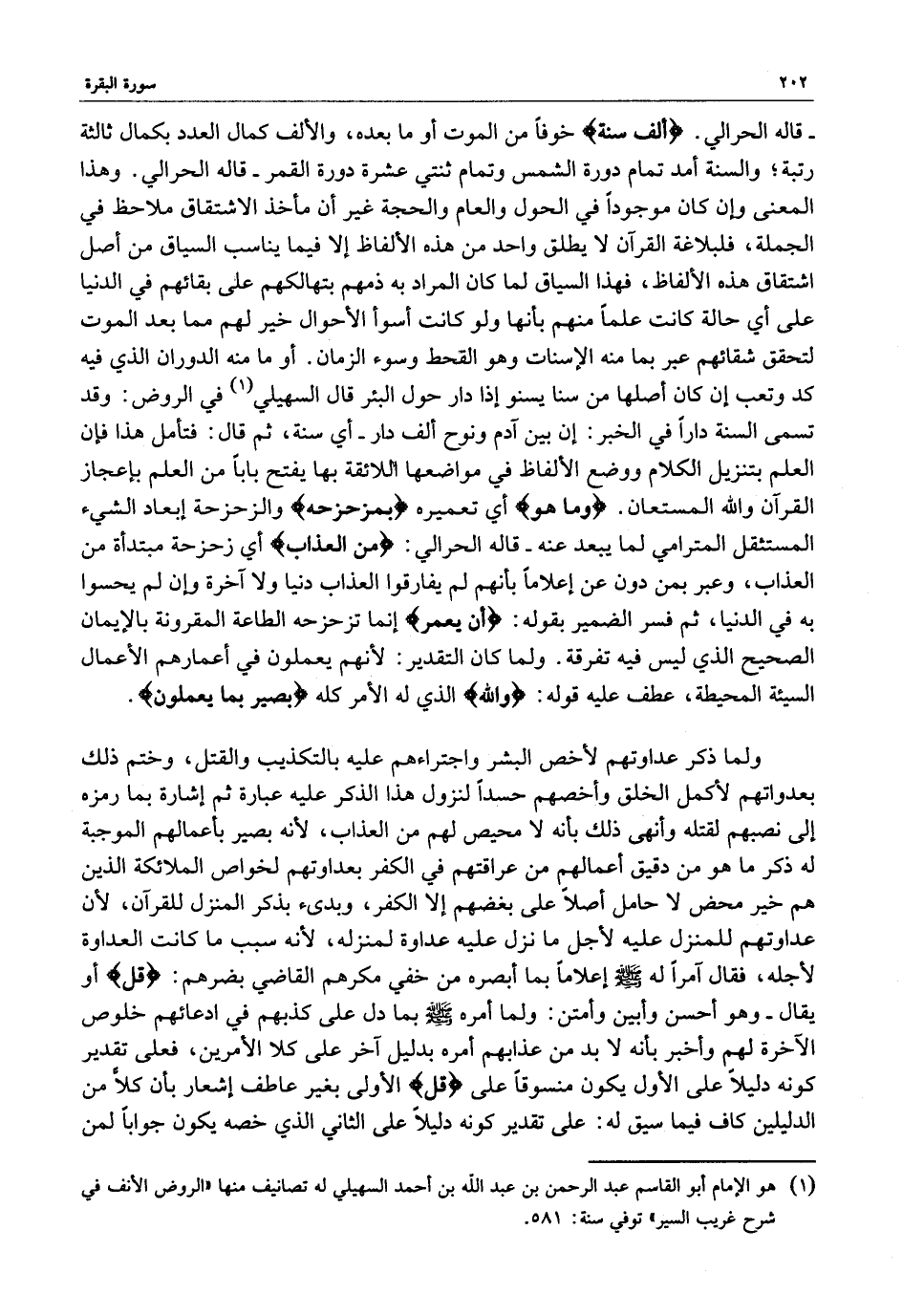 أو ما منه الدوران الذي فيه كد وتعب إن كان إصلها من سنا يسنو إذا دار حول البئر قال السهيلي في الروض : وقد تسمى السنة داراً في الخبر : إن بين آدم و نوح ألف دار - أي سنة ، ثم قال : فتأمل هذا فإن العلم بتنزيل الكلام ووضع الألفاظ في مواضعه اللائقة بها يفتح باباً من العلم بإعجاز القرآن والله المستعان .