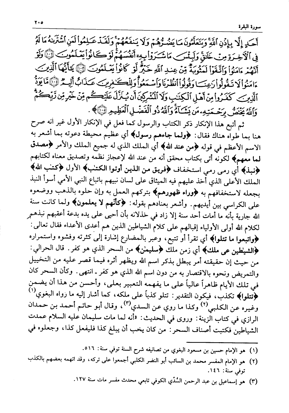 أَحَدٍ إِلاَّ بِإِذْنِ اللَّهِ وَيَتَعَلَّمُونَ مَا يَضُرُّهُمْ وَلاَ يَنفَعُهُمْ وَلَقَدْ عَلِمُواْ لَمَنِ اشْتَرَاهُ مَا لَهُ فِي الآخِرَةِ مِنْ خَلاَقٍ وَلَبِئْسَ مَا شَرَوْاْ بِهِ أَنْفُسَهُمْ لَوْ كَانُواْ يَعْلَمُونَ وَلَوْ أَنَّهُمْ آمَنُواْ واتَّقَوْا لَمَثُوبَةٌ مِّنْ عِندِ اللَّهِ خَيْرٌ لَّوْ كَانُواْ يَعْلَمُونَ يَاأَيُّهَا الَّذِينَ آمَنُواْ لاَ تَقُولُواْ رَاعِنَا وَقُولُواْ انْظُرْنَا وَاسْمَعُواْ وَلِلكَافِرِينَ عَذَابٌ أَلِيمٌ مَّا يَوَدُّ الَّذِينَ كَفَرُواْ مِنْ أَهْلِ الْكِتَابِ وَلاَ الْمُشْرِكِينَ أَن يُنَزَّلَ عَلَيْكُمْ مِّنْ خَيْرٍ مِّن رَّبِّكُمْ وَاللَّهُ يَخْتَصُّ بِرَحْمَتِهِ مَن يَشَآءُ وَاللَّهُ ذُو الْفَضْلِ الْعَظِيمِ ) 73