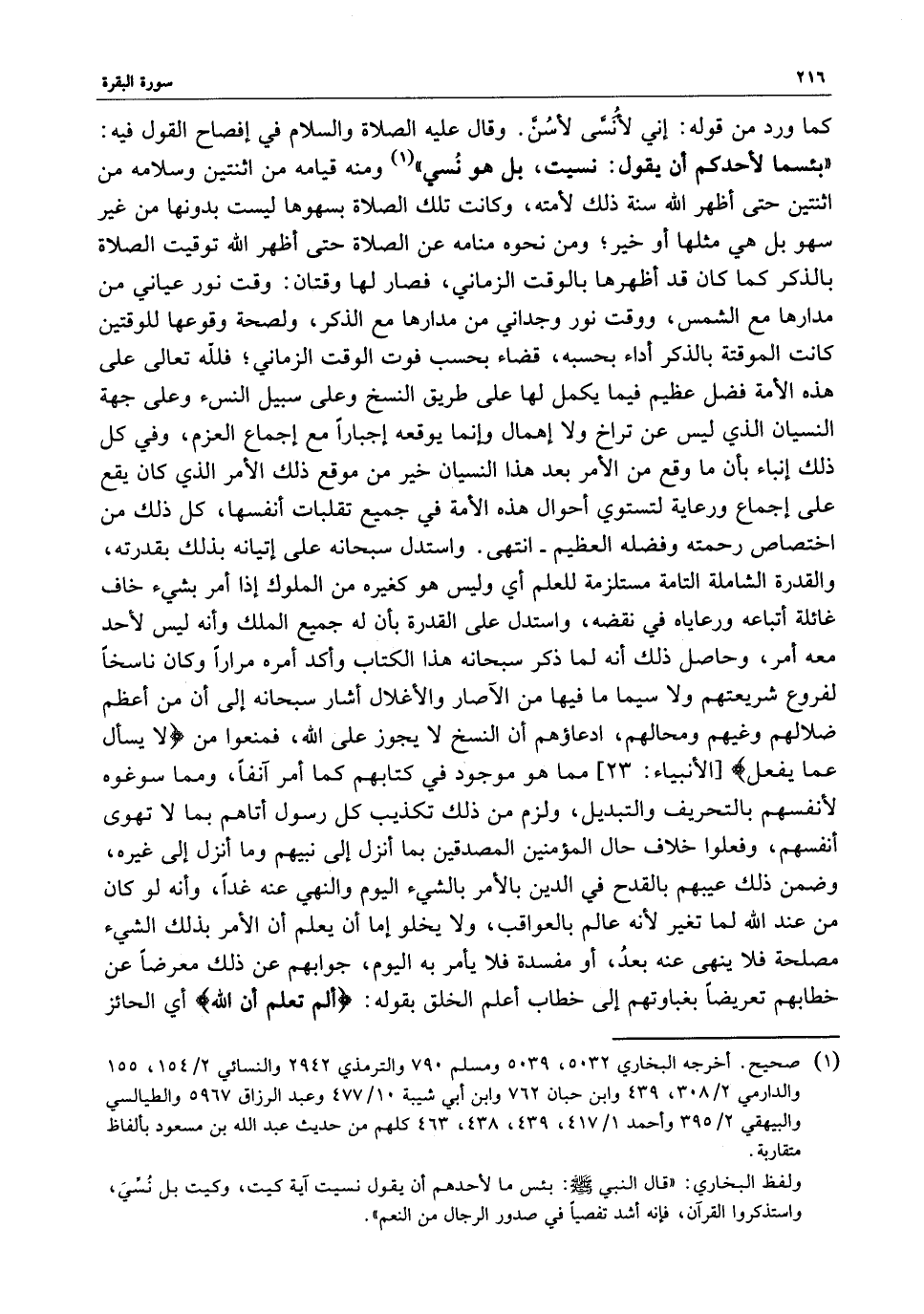 وقال عليه الصلاة والسلام في إفصاح القول فيه : ( بئسما لأحدكم أن يقول : نسيت ، بل هو نُسي ) ومنه قيامه من اثنتين وسلامه من اثنتين حتى أظهر الله سنة ذلك لأمته ، وكانت تلك الصلاة بسهوها ليست بدونها من غير سهو بل هي مثلها أو خير ؛ ومن نحوه منامه عن الصلاة حتى أظهر الله توقيت الصلاة بالذكر كما كان قد أظهرها بالوقت الزماني ، فصار لها وقتان : وقت نور عياني من مداره مع الشمس ، ووقت نور وجداني من مدارها مع الذكر ، ولصحة وقوعها للوقتين كانت الموقتة بالذكر أداء بحسبه ، قضاء بحسب فوت الوقت الزماني ؛ فللّه تعالى على هذه الأمة فضل عظيم فيما يكمل لها على طريق النسخ وعلى سبيل النسء وعلى جهة النسيان الذي ليس عن تراخ ولا إهمال وإنما يوقعه إجباراً مع إجماع العزم ، وفي كل ذلك إنباء بأن ما وقع من الأمر بعد هذا النسيان خير من موقع ذلك الأمر الذي كان يقع على إجماع ورعاية لتستوي أحوال هذه الأمة في جميع تقلبات أنفسها ، كل ذلك من اختصاص رحمته وفضله العظيم - انتهى .