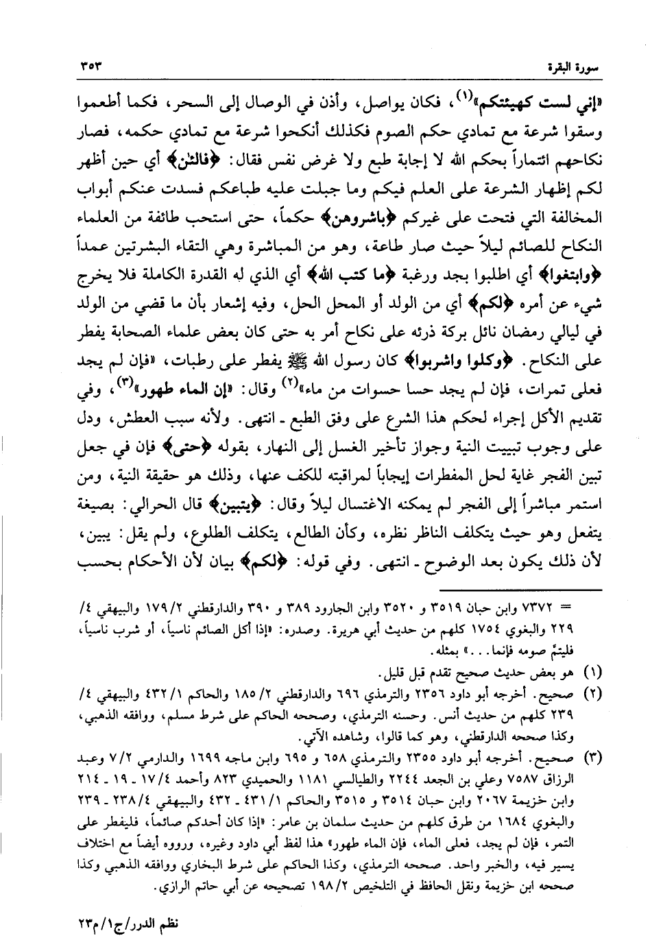 ولأنه سبب العطش ، ودل على وجوب تبييت النية وجواز تأخير الغسل إلى النهار ، بقوله ) حتى ( فإن في جعل تبين الفجر غاية لحل المفطرات إيجاباً لمراقبته للكف عنها ، وذلك هو حقيقة النية ، ومن استمر مباشراً إلى الفجر لم يمكنه الاغتسال ليلاً وقال : ( يتبين ( قال الحرالي : بصيغة يتفعل وهو حيث يتكلف الناظر نظره ، وكأن الطالع ، يتكلف الطلوع ، ولم يقل : يبين ، لأن ذلك يكون بعد الوضوح - انتهى .