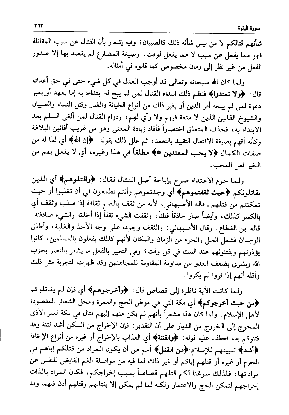 ولما حرم الاعتداء صرح بإباحة أصل القتال فقال : ( واقتلوهم ) أي الذين يقاتلونكم ) حيث ثقفتموهم ) أي وجدتموهم وأنتم تطمعون في أن تغلبوا أو حيث تمكنتم من قتلهم - قاله الأصبهاني ، لأنه من ثقف بالضم ثقافة إذا صلب وثقف أي بالكسر كذلك ، وايضاً صار حاذقاً فطناً ، وثقفت الشيء ثقفاً إذا أخذته والشيء صادفته - قاله ابن القطاع .
