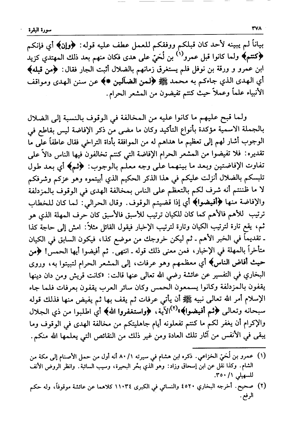 ثم أفيضوا أيها الحمس ) من حيث أفاض الناس ) أي معظمهم وهو عرفات ، إلى المشعر الحرام لتبيتوا به ، وروى البخاري في التفسير عن عائشة رضي الله تعالى عنها قالت : ( كانت قريش ومن دان دينها يقفون بالمزدلفة وكانوا يسمعون الحمس وكان سائر العرب يقفون بعرفات فلما جاء الإسلام أمر الله تعالى نبيه ( صلى الله عليه وسلم ) أن يأتي عرفات ثم يقف بها ثم يفيض منها فذلك قوله سبحانه وتعالى ) ثم أفيضوا ( ) الآية ، ) واستغفروا الله ) أي اطلبوا من ذي الجلال والإكرام أن يغفر لكم ما كنتم تفعلونه أيام جاهليتكم من مخالفة الهدى في الوقوف وما يبقى في الأنفس من آثار تلك العادة ومن غير ذلك من النقائص التي يعلمها الله منكم .
