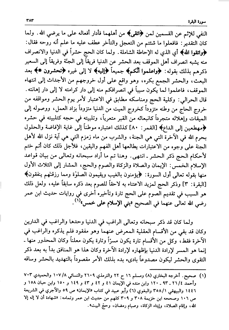 [ البقرة : 3 ] وذكر الحج لمزيد الاعتناء به لاحقاً للصوم بعد ذكره سابقاً عليه ، ولعل ذلك هو السبب في تقديم الصوم على الحج تارة وتأخيره أخرى في روايات حديث ابن عمر رضي الله تعالى عنهما في الصحيح ( بني الإسلام على خمس ) .