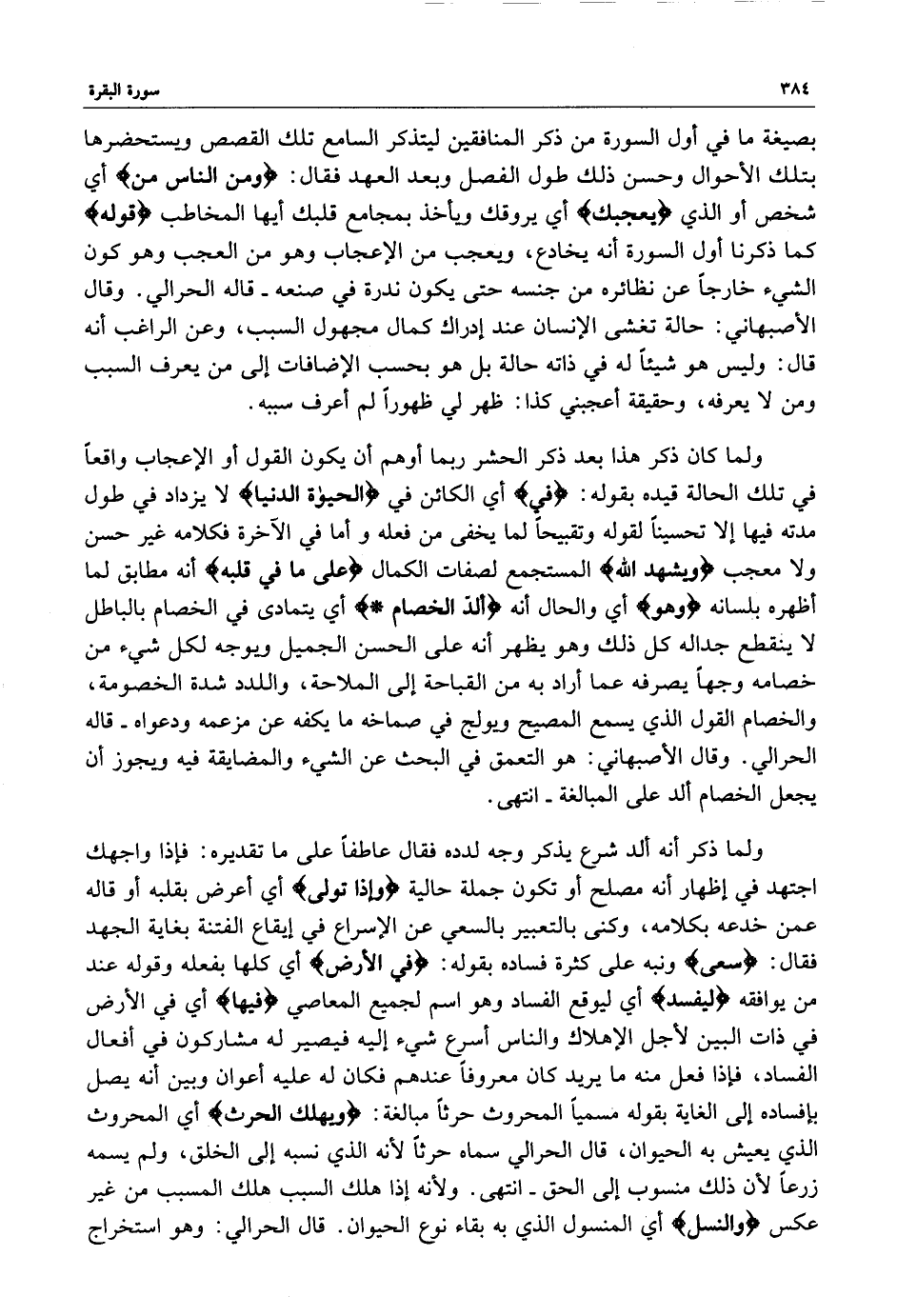 ولما ذكر أنه ألد شرع يذكر وجه لدده فقال عاطفاً على ما تقديره : فإذا واجهك اجتهد في إظهار أنه مصلح أو تكون جملة حالية ) وإذا تولى ) أي أعرض بقلبه أو قاله عمن خدعه بكلامه ، وكنى بالتعبير بالسعي عن الإسراع في إيقاع الفتنة بغاية الجهد فقال : ( سعى ( ونبه على كثرة فساده بقوله : ( في الأرض ) أي كلها بفعله وقوله عند من يوافقه ) ليفسد ) أي ليوقع الفساد وهو اسم لجميع المعاصي ) فيها ) أي في الأرض في ذات البين لأجل الإهلاك والناس أسرع شيء إليه فيصير له مشاركون في أفعال الفساد ، فإذا فعل منه ما يريد كان معروفاً عندهم فكان له عليه أعوان وبين أنه يصل بإفساده إلى الغاية بقوله مسمياً المحروث حرثاً مبالغة : ( ويهلك الحرث ) أي المحروث الذي يعيش به الحيوان ، قال الحرالي سماه حرثاً لأنه الذي نسبه إلى الخلق ، ولم يسمه زرعاً لأن ذلك منسوب إلى الحق - انتهى .