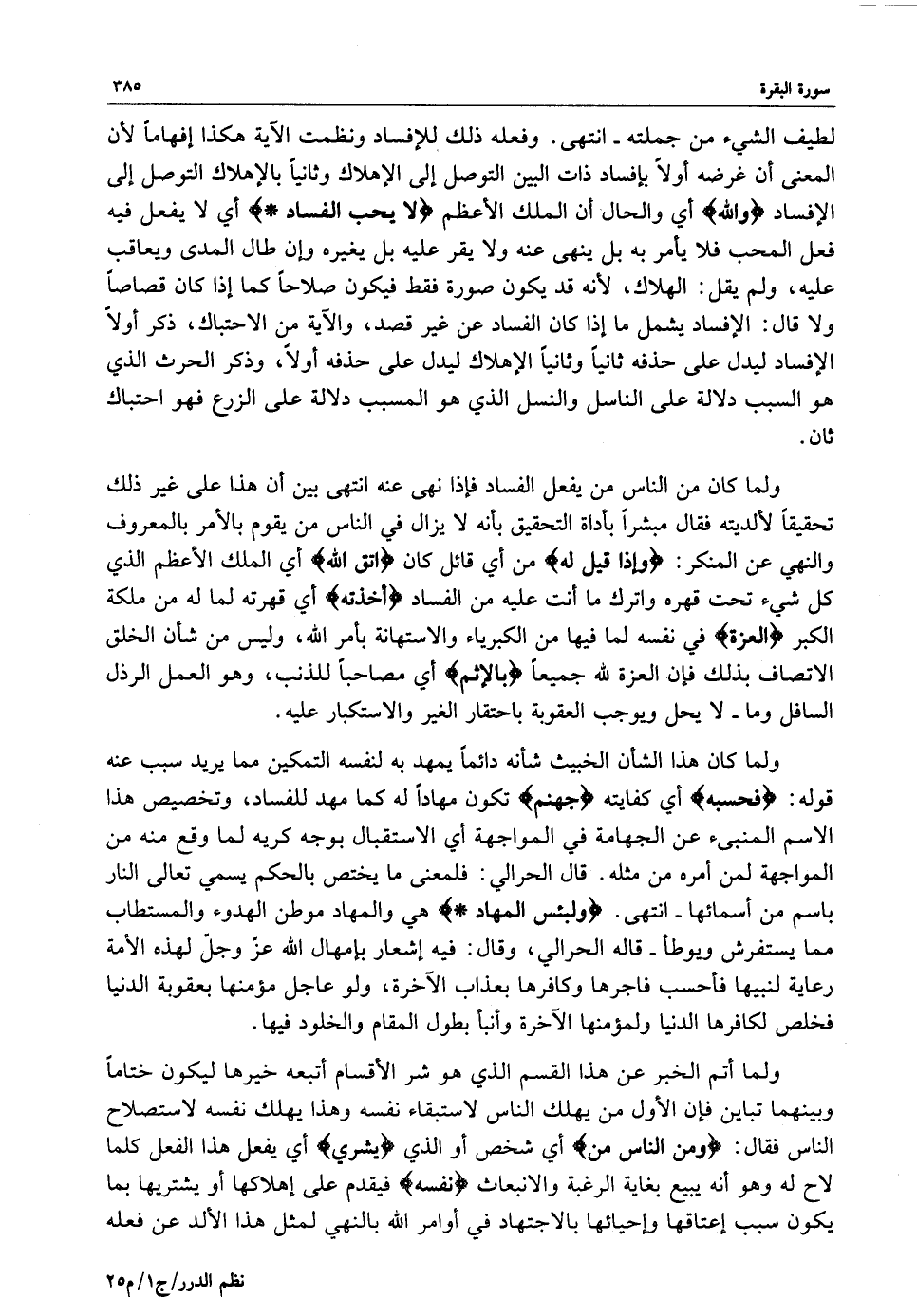 وفعله ذلك للإفساد ونظمت الآية هكذا إفهاماً لأن المعنى أن غرضه أولاً بإفساد ذات البين التوصل إلى الإهلاك وثانياً بالإهلاك التوصل إلى الإفساد ) والله ) أي والحال أن الملك الأعظم ) لا يحب الفساد ) أي لا يفعل فيه فعل المحب فلا يأمر به بل ينهى عنه ولا يقر عليه بل يغيره وإن طال المدى ويعاقب عليه ، ولم يقل : الهلاك ، لأنه قد يكون صورة فقط فيكون صلاحاً كما إذا كان قصاصاً ولا قال : الإفساد يشمل ما إذا كان الفساد عن غير قصد ، والآية من الاحتباك ، ذكر أولاً الإفساد ليدل على حذفه ثانياً وثانياً الإهلاك ليدل على حذفه أولاً ، وذكر الحرث الذي هو السبب دلالة على الناسل والنسل الذي هو المسبب دلالة على الزرع فهو احتباك ثان .