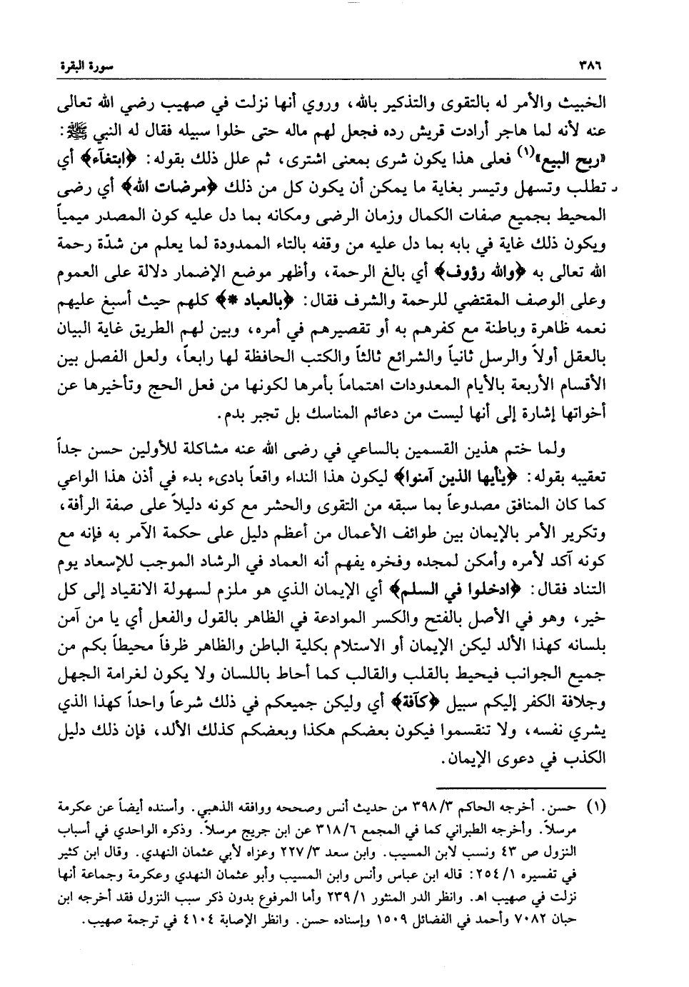 الخبيث والأمر له بالتقوى والتذكير بالله ، وروي أنها نزلت في صهيب رضي الله تعالى عنه لأنه لما هاجر أرادت قريش رده فجعل لهم ماله حتى خلوا سبيله فقال له النبي ( صلى الله عليه وسلم ) : ( ربح البيع ) فعلى هذا يكون شرى بمعنى اشترى ، ثم علل ذلك بقوله : ( ابتغاء ) أي تطلب وتسهل وتيسر بغاية ما يمكن أن يكون كل من ذلك ) مرضات الله ) أي رضى المحيط بجميع صفات الكمال وزمان الرضى ومكانه بما دل عليه كون المصدر ميمياً ويكون ذلك غاية في بابه بما دل عليه من وقفه بالتاء الممدودة لما يعلم من شدّة رحمة الله تعالى به ) والله رؤوف ) أي بالغ الرحمة ، وأظهر موضع الإضمار دلالة على العموم وعلى الوصف المقتضي للرحمة والشرف فقال : ( بالعباد ( كلهم حيث أسبغ عليهم نعمه ظاهرة وباطنة مع كفرهم به أو تقصيرهم في أمره ، وبين لهم الطريق غاية البيان بالعقل أولاً والرسل ثانياً والشرائع ثالثاً والكتب الحافظة لها رابعاً ، ولعل الفصل بين الأقسام الأربعة بالأيام المعدودات اهتماماً بأمرها لكونها من فعل الحج وتأخيرها عن أخواتها إشارة غلى أنها ليست من دعائم المناسك بل تجبر بدم .