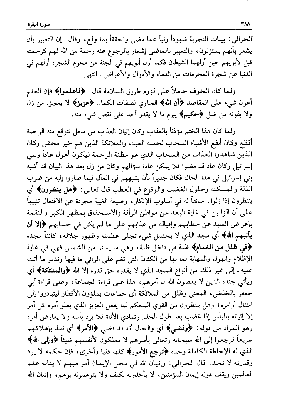 سائقاً له في أسلوب الإنكار ، وصيغة الغيبة مجردة عن الافتعال تنبيهاً على أنا لزالين في غاية البعد عن مواطن الرأفة والاستحقاق بمظهر الكبر والنقمة بإعراض السيد عن خطابهم وإقباله من عذابهم على ما لم يكن في حسابهم ) إلا أن يأتيهم الله ) أي مجد الذي لا يحتمل شيء تجلى عظمته وظهور جلاله ، كائناً مجده ) في ظلل من الغمام ( ظلة في داخل ظلة ، وهي ما يستر من الشمس فهي في غاية الإظلام والهول والمهابة لما لها من الكثافة التي تغم على الرائي ما فيها وتدمر ما أتت عليه - إلى غير ذلك من أنواع المجد الذي لا يقدره حق قدره إلا الله ) والملائكة ) أي ويأتي جنده الذين لا يعصون الله ما أمرهم ، هذا على قراءة الجماعة ، وعلى قراءة أبي جعفر بالخفض ، المعنى وظلل من الملائكة أي جماعات يملؤون الأقطار ليتبادروا إلى امتثال أوامره ؛ وهل ينتظرون من القوي المحكم لما يفعل العزيز الذي يعلو أمره كل أمر إلا إتيانه بالبأس إذا غضب بعد طول الحلم وتمادي الأناة فلا يرد بأسه ولا يعارض أمره وهو المراد من قوله : ( وقضي ) أي والحال أنه قد قضي ) الأمر ) أي نفذ بإهلاكهم سريعاً فرجعوا إلى الله سبحانه وتعالى بأسرهم لا يملكون لأنفسهم شيئاً ) وإلى الله ( الذي له الإحاطة الكاملة وحده ) ترجع الأمور ( كلها دنيا وأخرى ، فإن حكمه لا يرد وقدرته لا تحد .