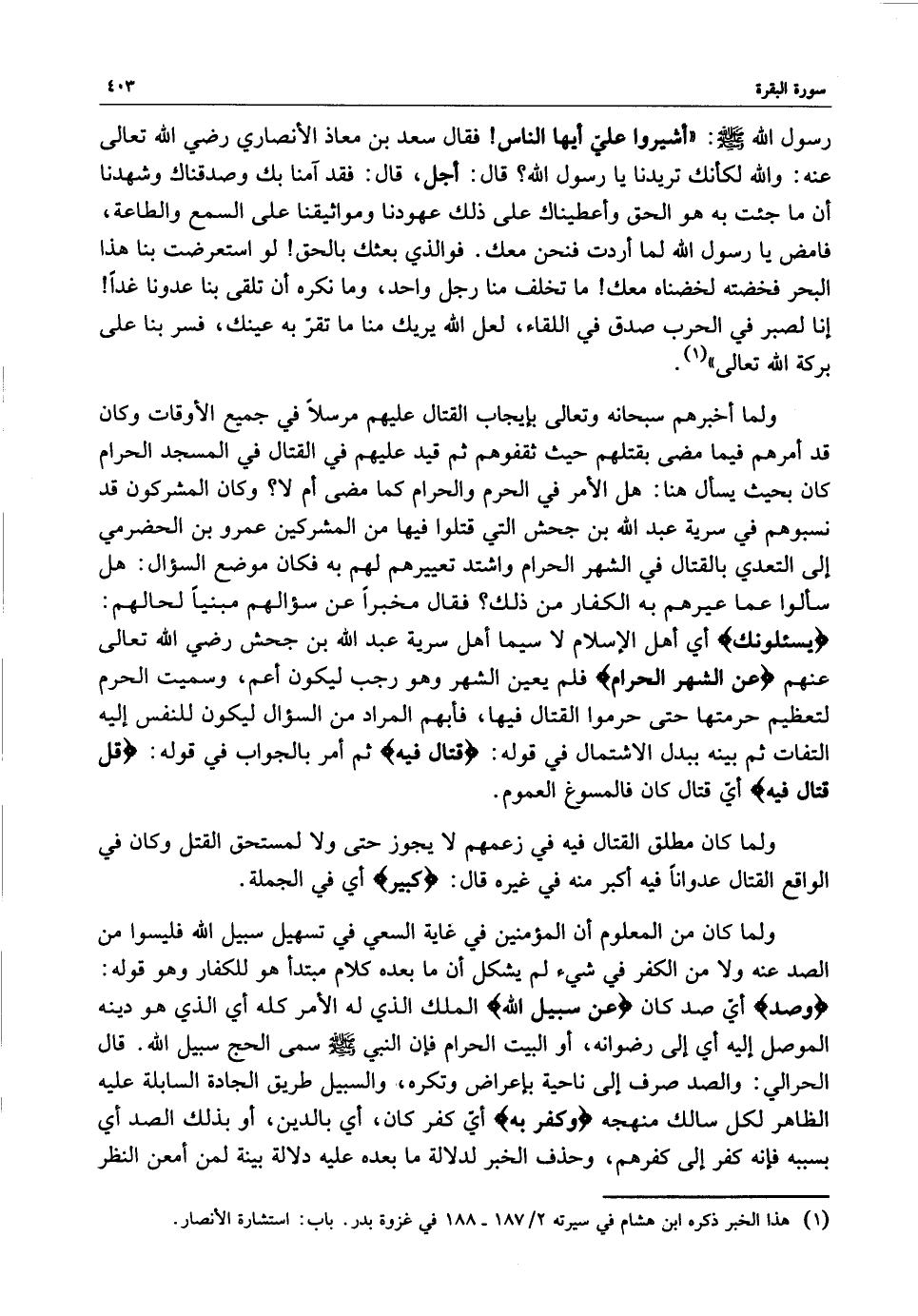 فوالذي بعثك بالحق لو استعرضت بنا هذا البحر قخضته لخضناه معك ما تخلف منا رجل واحد ، وما نكره أن تلقى بنا عدونا غداً إنا لصبر في الحرب صدق في اللقاء ، لعل الله يريك منا ما تقرّ به عينك ، فسر بنا على بركة الله تعالى ( .