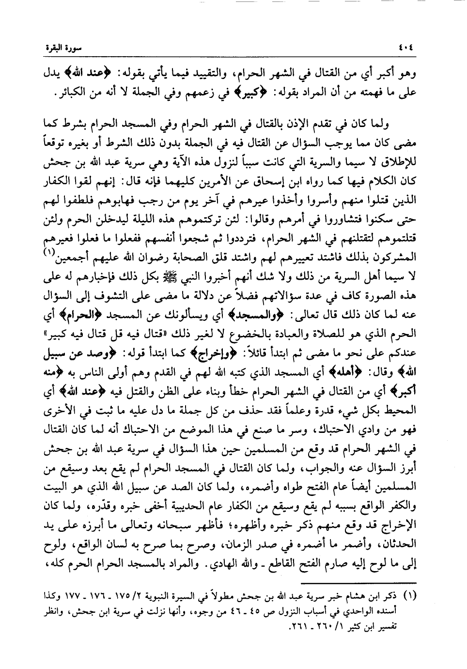 ولما كان في تقدم الإذن بالقتال في الشهر الحرام وفي المسجد الحرام بشرط كما مضى كان مما يوجب السؤال عن القتال فيه في الجملة بدون ذلك الشرط أو بغيره توقعاً للإطلاق لا سيما والسرية التي كانت سبباً لنزول هذه الآية وهي سرية عبد الله بن جحش كان الكلام فيها كما رواه ابن إسحاق عن الأمرين كليهما فإنه قال : إنهم لقوا الكفار الذين قتلوا منهم وأسروا وأخذوا عيرهم في آخر يوم من رجب فهابوهم فلطفوا لهم حتى سكنوا فتشاوروا في أمرهم وقالوا : لئن تركتموهم هذه الليلة ليدخلن الحرم ولئن قتلتموهم لتقتلنهم في الشهر الحرام ، فترددوا ثم شجعوا أنفسهم ففعلوا ما فعلوا فعيرهم المشركون بذلك فاشتد تعييرهم لهم واشتد قلق الصحابة رضوان الله عليهم أجمعين لا سيما أهل السرية من ذلك ولا شك أنهم أخبروا النبي ( صلى الله عليه وسلم ) بكل ذلك فإخبارهم له على هذه الصورة كاف في عدة سؤالاتهم فضلاً عن دلالة ما مضى على التشوف إلى السؤال عنه لما كان ذلك قال تعالى : ( والمسجد ) أي ويسألونك عن المسجد ) الحرام ) أي الحرم الذي هو للصلاة والعبادة بالخضوع لا لغير ذلك ) قتال فيه قل قتال فيه كبير ( عندكم على نحو ما مضى ثم ابتدأ قائلاً : ( وإخراج ( كما ابتدأ قوله : ( وصد عن سبيل الله ( وقال : ( أهله ) أي المسجد الذي كتبه الله لهم في القدم وهم أولى الناس به ) منه أكبر ) أي من القتال في الشهر الحرام خطأ وبناء على الظن والقتل فيه ) عند الله ) أي المحيط بكل شيء قدرة وعلماً فقد حذف من كل جملة ما دل عليه ما ثبت في الأخرى فهو من وادي الاحتباك ، وسر ما صنع في هذا الموضع من الاحتباك أنه لما كان القتال في الشهر الحرام قد وقع من المسلمين حين هذا السؤال في سرية عبد الله بن جحش أبرز السؤال عنه والجواب ، ولما كان القتال في المسجد الحرام لم يقع بعد وسيقع من المسلمين أيضاً عام الفتح طواه وأضمره ، ولما كان الصد عن سبيل الله الذي هو البيت والكفر الواقع بسببه لم يقع وسيقع من الكفار عام الحديبية أخفى خبره وقدّره ، ولما كان الإخراج قد وقع منهم ذكر خبره وأظهره ؛ فأظهر سبحانه وتعالى ما أبرزه على يد الحدثان ، وأضمر ما أضمره في صدر الزمان ، وصرح بما صرح به لسان الواقع ، ولوح إلى ما لوح إليه صارم الفتح القاطع - والله الهادي .