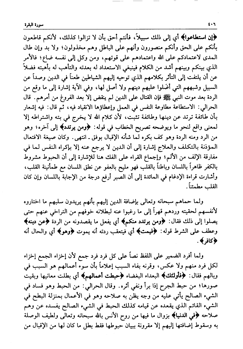 ) إن استطاعوا ) أي إلى ذلك سبيلاً ، فأنتم أحق بأن لا تزالوا كذلك ، لأنكم قاطعون بأنكم على الحق وأنكم منصورون وأنهم على الباطل وهم مخذولون ؛ ولا بد وإن طال المدى لاعتمادكم على الله واعتمادهم على قوتهم ، ومن وكل إلى نفسه ضاع ؛ فالأمر الذي بينكم وبينهم أشد من الكلام فينبغي الاستعداد له بعدته والتأهب له بأهبته فضلاً عن أن يلتفت إلى التأثر بكلامهم الذي توحيه إليهم الشياطين طعناً في الدين وصداً عن السبيل وشبههم التي أضَلوا عليهم دينهم ولا أصل لها ، وفي الآية إشارة إلى ما وقع من الردة بعد موت النبي ( صلى الله عليه وسلم ) فإن القتال على الدين لم ينقض إلا بعد الفروغ من أمرهم .