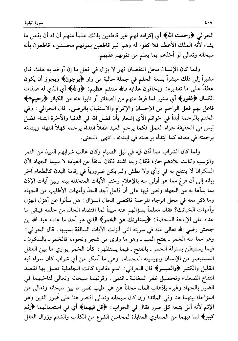 قال الحرالي : وهو مما منه الخمر - بفتح الميم - وهو ما وارى من شجر ونحوه ، فالخمر - بالسكون - فيما يستبطن بمنزلة الخمر - بالفتح - فيما يستظهر ، كأن الخمر يواري ما بين العقل المستبصر من الإنسان وبهيميته العجماء ، وهي ما أسكر من اي شراب كان سواء فيه القليل والكثير ) والميسر ( قال الحرالي : اسم مقامرة كانت الجاهلية تعمل بها لقصد انتفاع الضعفاء وتحصيل ظفر المغالبة - انتهى .