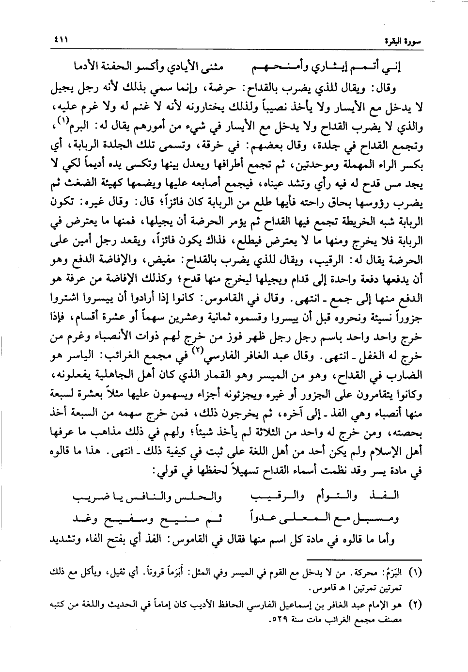 وقال عبد الغافر الفارسي في مجمع الغرائب : الياسر هو الضارب في القداح ، وهو من الميسر وهو القمار الذي كان أهل الجاهلية يفعلونه ، وكانوا يتقامرون على الجزور أو غيره ويجزئونه أجزاء ويسهمون عليها مثلاً بعشرة لسبعة منها أنصباء وهي الفذ - إلى آخره ، ثم يخرجون ذلك ، فمن خرج سهمه من السبعة أخذ بحصته ، ومن خرج له واحد من الثلاثة لم يأخذ شيئاً ؛ ولهم في ذلك مذاهب ما عرفها أهل الإسلام ولم يكن أحد من أهل اللغة على ثبت في كيفية ذلك - انتهى .