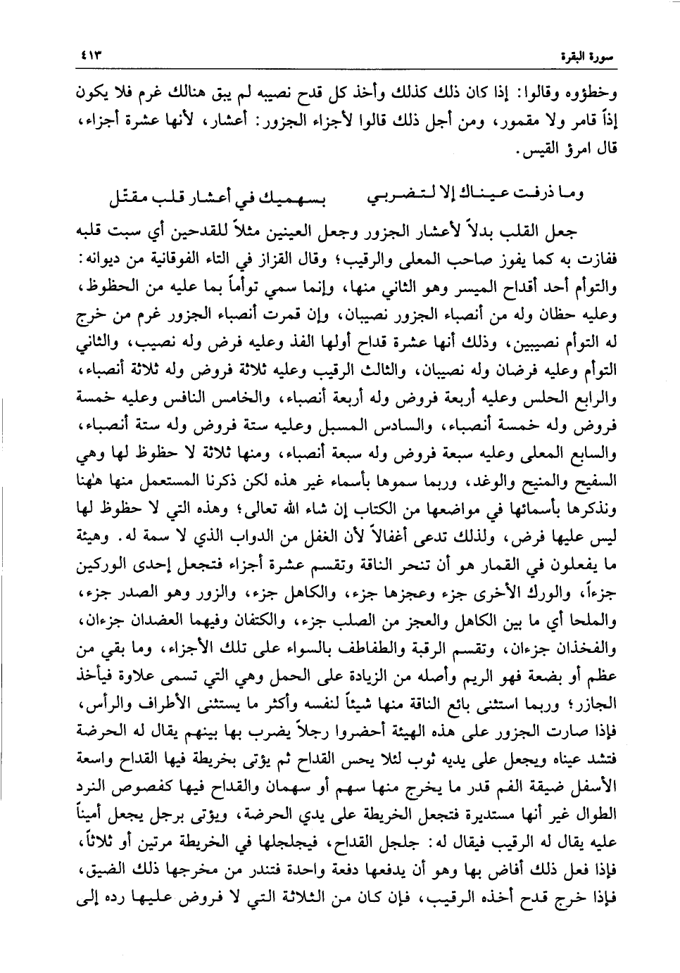 وخطؤوه وقالوا : إذا كان ذلك كذلك وأخذ كل قدح نصيبه لم يبق هنالك غرم فلا يكون إذاً قامر ولا مقمور ، ومن أجل ذلك قالوا لأجزاء الجزور : أعشار ، لأنها عشرة أجزاء ، قال امرؤ القيس .