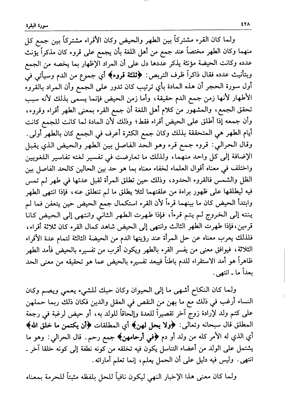 وقال الحرالي : قروء جمع قرء وهو الحد الفاصل بين الطهر والحيض الذي يقبل الإضافة إلى كل واحد منهما ، ولذلك ما تعارضت في تفسير لغته تفاسير اللغويين واختلف في معناه أقوال العلماء لخفاء معناه بما هو حد بين الحالين كالحد الفاصل بين الظل والشمس فالقروء الحدود ، وذلك حين تطلق المرأة لقبل عدتها في طهر لم تمس فيه ليطلقها على ظهور براءة من علقتهما لئلا يطلق ما لم تنطلق عنه ، فإذا انتهى الطهر وابتدأ الحيض كان ما بينهما قرءاً لأن القرء استكمال جمع الحيض حين يتعفن فما لم ينته إلى الخروج لم يتم قرءاً ، فإذا طهرت الطهر الثاني وانتهى إلى الحيض كانا قرءين ، فإذا طهرت الطهر الثالث وانتهى إلى الحيض شاهد كمال القرء كان ثلاثة أقراء ، فلذلك يعرب معناه عن حل المرأة عند رؤيتها الدم من الحيضة الثالثة لتمام عدة الأقراء الثلاثة ، فيوافق معنى من يفسر القرء بالطهر ويكون أقرب من تفسيره بالحيض فأمد الطهر ظاهراً هو أمد الاستقراء للدم باطناً فيبعد تفسيره بالحيض عما هو تحقيقه من معنى الحد بعداً ما - انتهى .