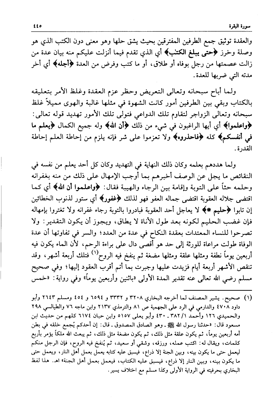 ولما هددهم بعلمه وكان ذلك النهاية في التهديد وكان كل أحد يعلم من نفسه في النقائص ما يجل عن الوصف أخبرهم بما أوجب الإمهال على ذلك من منه بغفرانه وحلمه حثاً على التوبة وإقامة بين الرجاء والهيبة فقال : ( واعلموا أن الله ) أي كما اقتضى جلاله العقوبة اقتضى جماله العفو فهو لذلك ) غفور ) أي ستور لذنوب الخطائين إن تابوا ) حليم ( لا يعاجل أحد العقوبة فبادروا بالتوبة رجاء غفرانه ولا تغتروا بإمهاله فإن غضب الحليم لكونه بعد طول الأناة لا يطاق ، ويجوز أن يكون التقدير : ولا تصرحوا للنساء المعتدات بعقدة النكاح في عدة من العدد ؛ والسر في تفاوتها أن عدة الوفاة طولت مراعاة للورثة إلى حد هو أقصى دال على براءة الرحم ، لأن الماء يكون فيه أربعين يوماً نطفة ومثلها علقة ومثلها مضغة ثم ينفخ فيه الروح فتلك أربعة أشهر ، وقد تنقص الأشهر أربعة أيام فزيدت عليها وجبرت بما أتم أقرب العقود إليها ؛ وفي صحيح مسلم رضي الله تعالى عنه تقدير المدة الأولى ( باثنين وأربعين يوماً ) وفي رواية : ( خمس