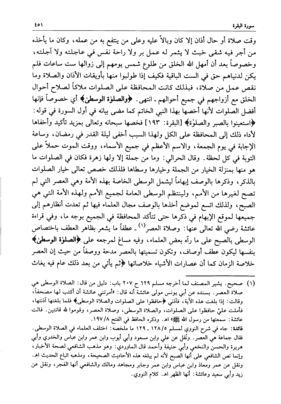 وقال الحرالي : وما من جملة إلا ولها زهرة فكان في الصلوات ما هو منها بمنزلة الخيار من الجملة وخيارها وسطاها فلذلك خصص تعالى خيار الصلوات بالذكر ، وذكرها بالوصف إبهاماً ليشمل الوسطى الخاصة بهذه الأمة وهي العصر التي لم تصح لغيرها من الأمم ، ولينتظم الوسطى العامة لجميع الأمم ولهذه الأمة التي هي الصبح ، ولذلك اتسع لموضع أخذها بالوصف مجال العلماء فيها ثم تعدت أنظارهم إلى جميعها لموقع الإبهام في ذكرها حتى تتأكد المحافكة في الجميع بوجه ما ، وفي قراءة عائشة رضي الله تعالى عنها : وصلاة العصر - عطفاً ما يشعر بظاهر العطف باختصاص الوسطى بالصبح على ما رآه بعض العلماء ، وفيه مساغ لمرجعه على ) الصلاة الوسطى ( بنفسها ليكون عطف أوصاف ، وتكون تسميتها بالعصر مدحة ووصفاً من حيث إن العصر خلاصة الزمان كما أن عصارات الأشياء خلاصاتها