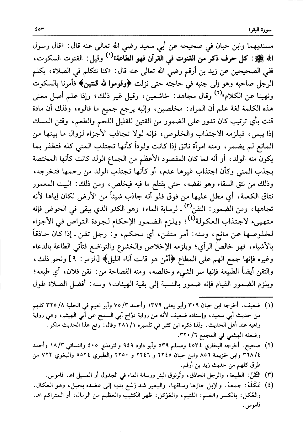 مسنديهما وابن حبان في صحيحه عن أبي سعيد رضي الله تعالى عنه قال : قال رسول الله ( صلى الله عليه وسلم ) : ( كل حرف ذكر من القنوت في القرآن فهو الطاعة ) وقيل : القنوت السكوت ، ففي الصحيحين عن زيد بن أرقم رضي الله تعالى عنه قال : ( كنا نتكلم في الصلاة ، يكلم الرجل صاحبه وهو إلى جنبه في حاجته حتى نزلت ) وقوموا لله قانتين ( فأمرنا بالسكوت ونهينا عن الكلام ) وقال مجاهد : خاشعين ، وقيل غير ذلك ؛ وإذا علم أصل معنى هذه الكلمة لغة علم أن المراد : مخلصين ، وإليه يرجع جميع ما قالوه ، وذلك أن مادة قنت بأي ترتيب كان تدور على الضمور من القتين للقليل اللحم والطعم ، وقتن المسك إذا يبس ، فيلزمه الاجتذاب والخلوص ، فإنه لولا تجاذب الأجزاء لزوال ما بينها من المانع لم يضمر ، ومنه امرأة ناتق إذا كانت ولوداً كأنها تجتذب المني كله فتظفر بما يكون منه الولد ، أو أنه لما كان المقصود الأعظم من الجماع الولد كانت كأنها المختصة بجذب المني وكأن اجتذاب غيرها عدم ، أو كأنها تجتذب الولد من رحمها فتخرجه ، وذلك من نتق السقاء وهو نفضه ، حتى يقتلع ما فيه فيخلص ، ومن ذلك : البيت المعمور نتاق الكعبة ، أي مطل عليها من فوق فلو أنه جاذب شيئاً من الأرض لكان إياها لأنه تجاهها ، ومن الضمور : التقن - لرسابة الماء ؛ وهو الكدر الذي يبقى في الحوض فإنه متهيئ لاجتذاب العكولة ؛ ويلزم الضمور الإحكام لجودة التراص في الأجزاء لخلوصها عن مانع ، ومنه : أمر متقن ، أي محكم ، و : رجل تقن - إذا كان حاذقاً بالأشياء ، فهو خالص الرأي ؛ ويلزمه الإخلاص والخشوع والتواضع فتأتي الطاعة بالدعاء وغيره فإنها جمع الهم على المطاع