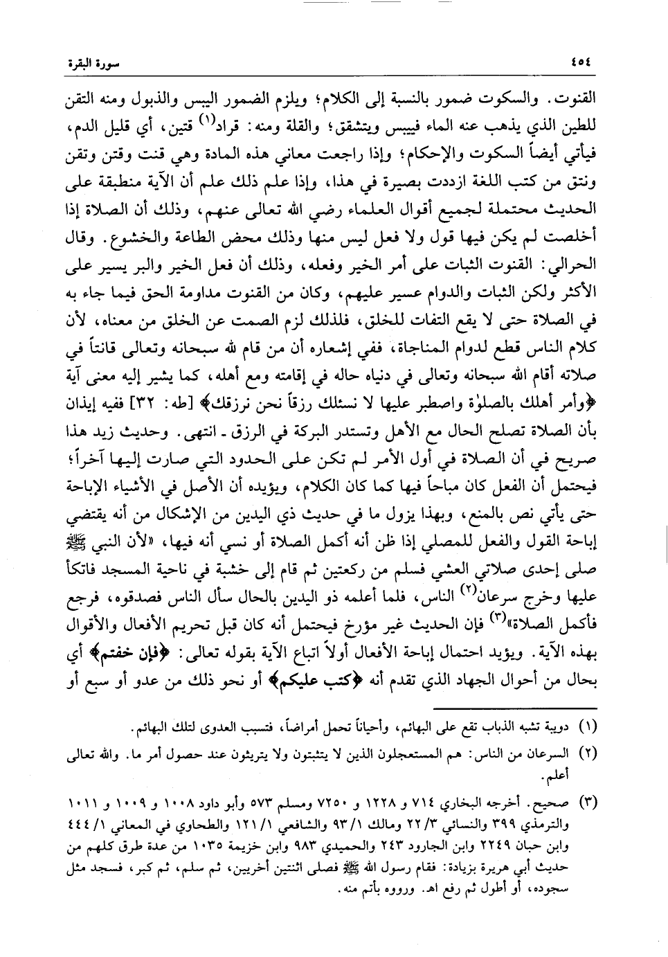 والسكوت ضمور بالنسبة إلى الكلام ؛ ويلزم الضمور اليبس والذبول ومنه التقن للطين الذي يذهب عنه الماء فييبس ويتشقق ؛ والقلة ومنه : قراد قتين ، أي قليل الدم ، فيأتي أيضاً السكوت والإحكام ؛ وإذا راجعت معاني هذه المادة وهي قنت وقتن وتقن ونتق من كتب اللغة ازددت بصيرة في هذا ، وإذا علم ذلك علم أن الآية منطبقة على الحديث محتملة لجميع أقوال العلماء رضي الله تعالى عنهم ، وذلك أن الصلاة إذا أخلصت لم يكن فيها قول ولا فعل ليس منها وذلك محض الطاعة والخشوع .