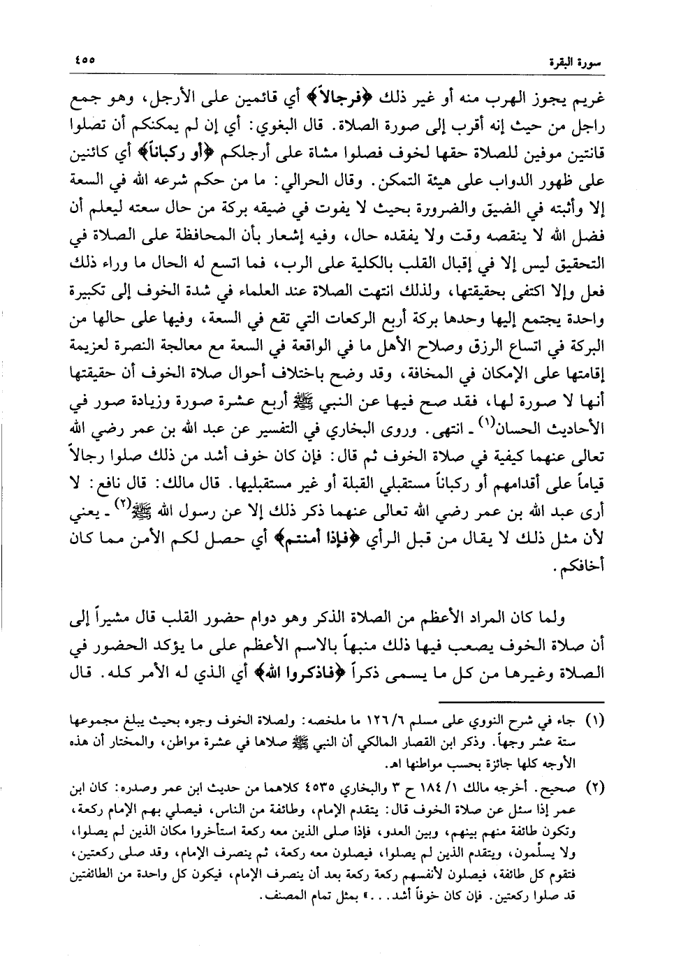 قال البغوي : أي إن لم يمكنكم أن تصلوا قانتين موفين للصلاة حقها لخوف فصلوا مشاة على أرجلكم ) أو ركباناً ) أي كائنين على ظهور الدواب على هيئة التمكن .