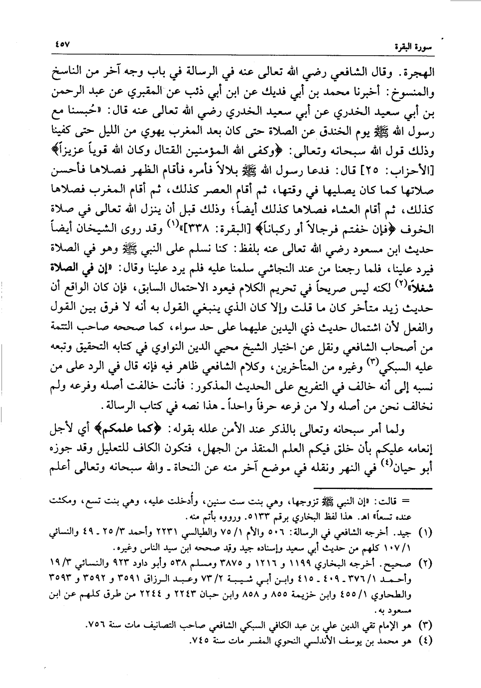 وقال الشافعي رضي الله تعالى عنه في الرسالة في باب وجه آخر من الناسخ والمنسوخ : أخبرنا محمد بن أبي فديك عن ابن أبي ذئب عن المقبري عن عبد الرحمن بن أبي سعيد الخدري عن أبي سعيد الخدري رضي الله تعالى عنه قال : ( حُبسنا مع رسول الله ( صلى الله عليه وسلم ) يوم الخندق عن الصلاة حتى كان بعد المغرب يهوي من الليل حتى كفينا وذلك قول الله سبحانه وتعالى :