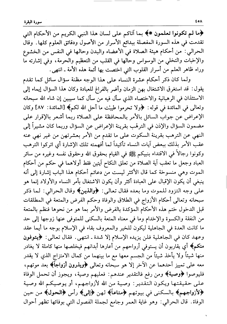 [ المائدة : 87 ] وكان الإعراض عن جواب السائل بالأمر بالمحافظة على الصلاة ربما أشعر بالإقرار على مضمون السؤال والإذن في الترهّب بقرينة الإعراض عن السؤال وربما كان مشيراً إلى النهي عن الترهب بقرينة السكوت على ما تقدم من الأمر بعشرتهن من غير نهي عنه عقب الأمر بذلك ببعض آيات النساء تأكيداً لما أفهمته تلك الإشارة أي اتركوا الترهب وكونوا رجالاً في الاقتداء بنبيكم ( صلى الله عليه وسلم ) في القيام بحقوق الله وحقوق نفسه وغيره من سائر العباد وجعل ما تعقب آية الصلاة من تعلق النكاح آيتين فقط أولاهما في حكم من أحكام الموت وهي منسوخة كما قال الأكثر ليست من دعائم أحكام هذا الباب إشارة إلى أنه ينبغي أن يكون الإقبال على العبادة أكثر وأن يكون الاشتغال بأمر النساء والأولاد إنما هو على وجه التزود للموت وما بعده فقال تعالى : ( والذين ( وقال الحرالي : لما ذكر سبحانه وتعالى أحكام الأزواج في الطلاق والوفاة وحكم الفرض والمتعة في المطلقات قبل الدخول ختم هذه الأحكام المؤكدة بالفرض والأمر بما هو من نحوها فنظم بالمتعة من النفقة والكسوة والإخدام وما في معناه المتعة بالسكنى للمتوفى عنها زوجها إلى حد ما كانت العدة في الجاهلية ليكون للخير والمعروف بقاء في الإسلام بوجه ما أيما عقد وعهد كان في الجاهلية فلن يزيده الإسلام إلا شدة - انتهى .