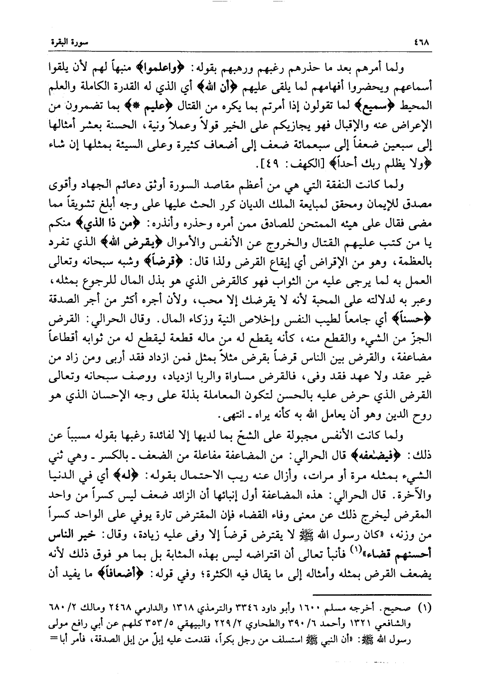 قال الحرالي : هذه المضاعفة أول إنبائها أن الزائد ضعف ليس كسراً من واحد المقرض ليخرج ذلك عن معنى وفاء القضاء فإن المقترض تارة يوفي على الواحد كسراً من وزنه ، ( كان رسول الله ( صلى الله عليه وسلم ) لا يقترض قرضاً إلا وفى عليه زيادة ، وقال : خير الناس أحسنهم قضاء ) فأنبأ الله تعالى أن اقتراضه ليس بهذه المثابة بل بما هو فوق ذلك لأنه يضعف القرض بمثله وأمثاله غلى ما يقال فيه الكثرة ؛ وفي قوله : ( أضعافاً ( ما يفيد أن